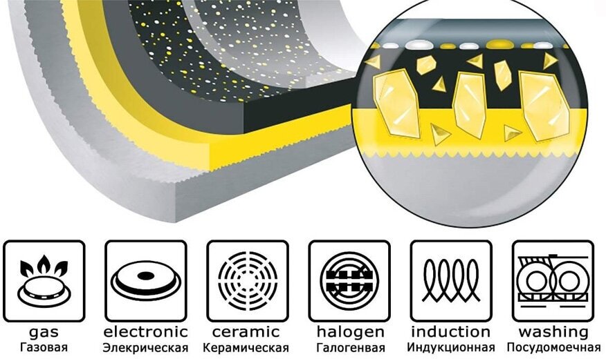 | Совместимые плиты | для газовых плит, для галогеновых конфорок, для духовки, для индукционных плит, для стеклокерамических плит, для электрических плит |