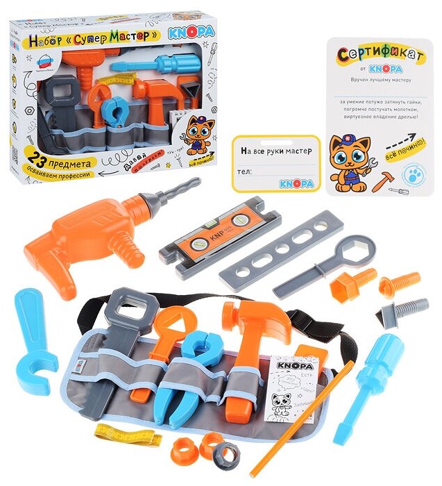 Набор инструментов Супер Мастер состоит из 23 предметов: пояс для инструментов, как у настоящего мастера, дрель, сертификат лучшего мастера, планка длинная/короткая, молоток, отвертка, пила, клещи, лента для измерений, уровень, различные виды гаек, болтов и ключей, карандаш и блокнотик для важных записей, а также бейдж На все руки мастер.