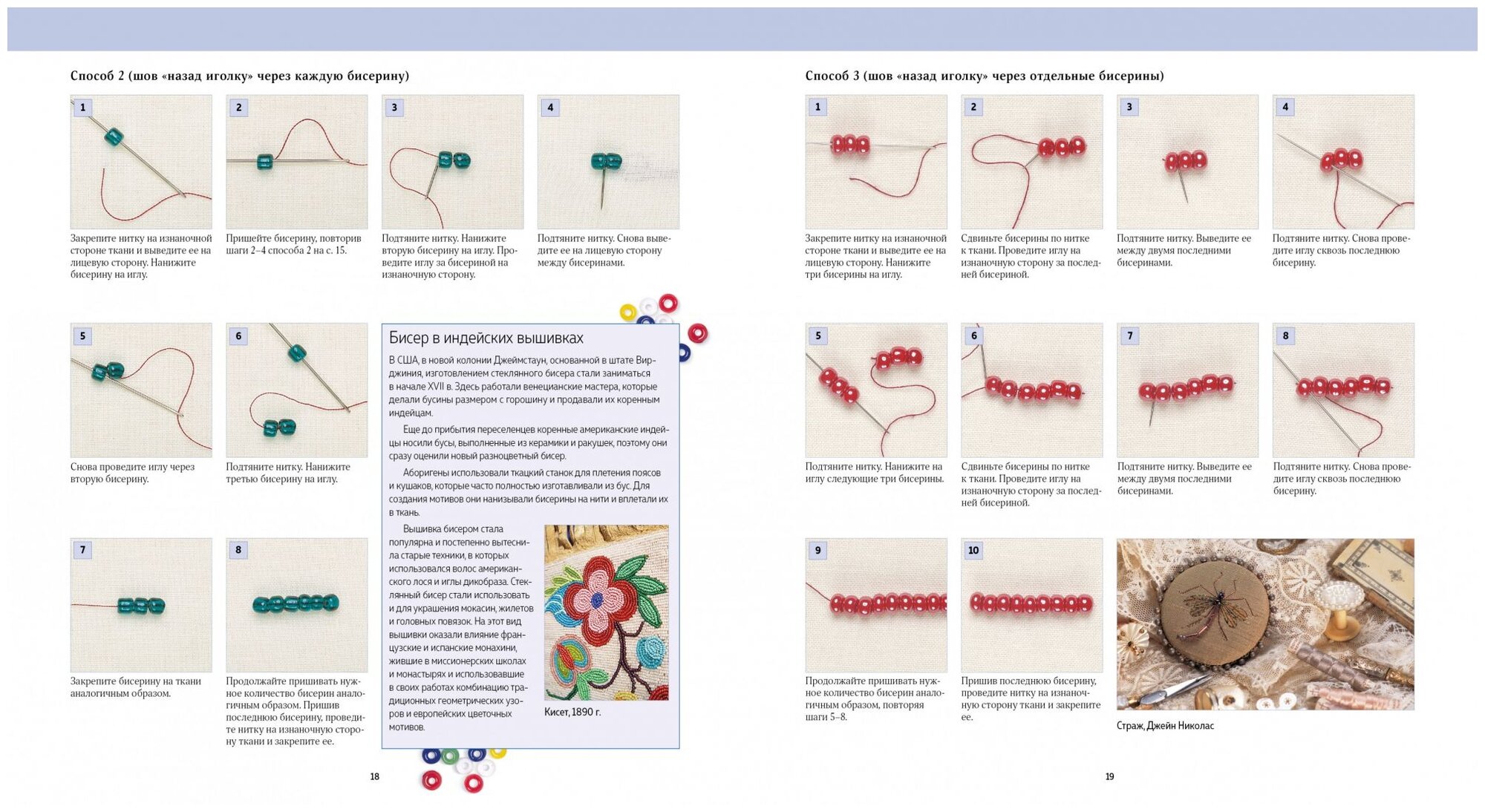 Очень достойная книга! Впрочем, то же самое можно сказать и о всей данной серии книг по вышивке. Просто удивительно, как в таком небольшом по объему руководству (всего 125 страниц форматом примерно как школьный дневник, только чуть шире) уместилось столько полезной информации! Никакой воды, лирики, фото котов или собак автора, а также ее детей, внуков, бабушек и прабабушек. И никакой километровой истории бисерной вышивки, начиная от времен первобытно-общинного строя! Все кратко, четко и по делу. Правда, на некоторых страницах (там, где помещены пошаговые инструкции по вышивке бисером) иллюстраций насчитывается по 12 на каждой! И это, на мой взгляд, один из немногих недостатков книги - ее формат можно было бы и увеличить. Но, в принципе, все детали вышивального процесса прекрасно видны и на таком формате - это все-таки не алмазная вышивка!