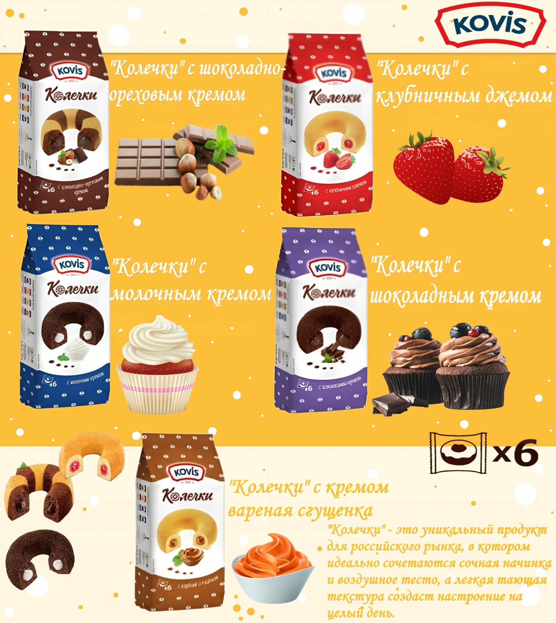 Линейка бренда KOVIS представлена несколькими видами продукции: мини-маффины, рулеты, песочные и каталонские пироги, капкейки и абсолютно новый продукт – колечки. "Колечки" - это уникальный продукт для российского рынка, в котором идеально сочетаются сочная начинка и воздушное тесто, а легкая тающая текстура создаст настроение на целый день.1. "Колечки" с шоколадным кремом 240гр2. "Колечки" с шоколадно-ореховым кремом 240гр 3. "Колечки" с молочным кремом 240гр4. "Колечки" с клубничным джемом 240гр5. "Колечки" с кремом вареная сгущенка 240гр