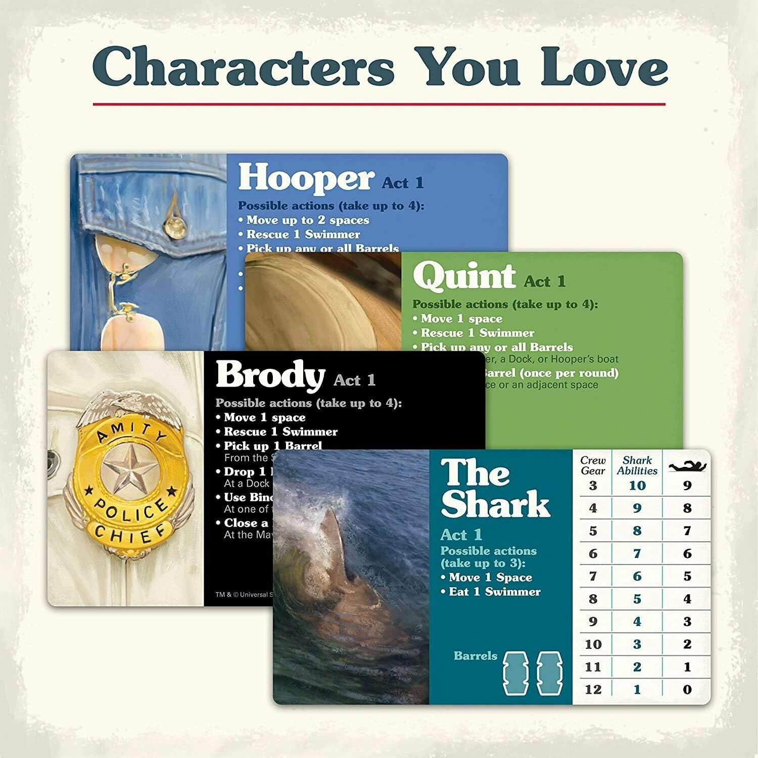 Один игрок выбирает в качестве персонажа Акулу. Остальные игроки выбирают в качестве персонажей Квинта, шерифа Броуди и Хупера – членов Экипажа, которым предстоит работать сообща, чтобы устранить Акулу. Игра состоит из двух действий, причем успех в Действии 1 обеспечивает преимущество в Действии 2. Также можно разыграть каждое действие по отдельности в качестве более короткой партии.