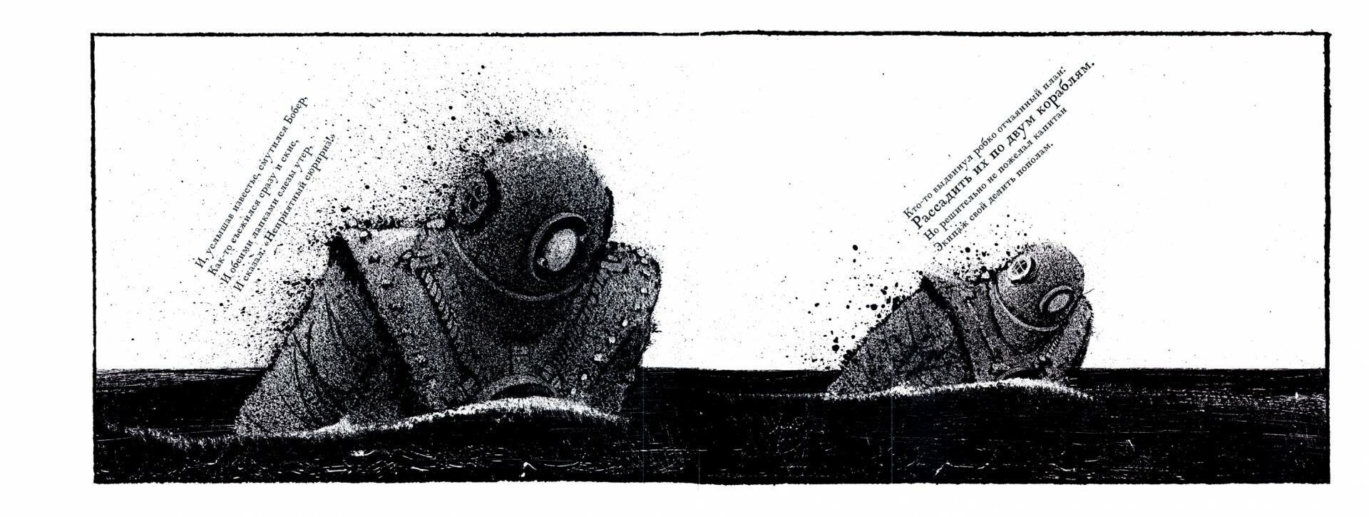 Мир абсурда и нелепицы в интерпретации Игоря Олейникова заполнен гротескными милитаризованными образами. Сюжет в иллюстрациях развивается какой-то своей, параллельной тексту жизнью: со дна всплывают брутальные водолазы, команда охотников подобно репинским бурлакам тянет ремнями старый военный корабль, на котором вздыбился Юнион Джек, а Булочник явно попал в экспедицию прямо с больничной койки, сбежав с обследования головного мозга.