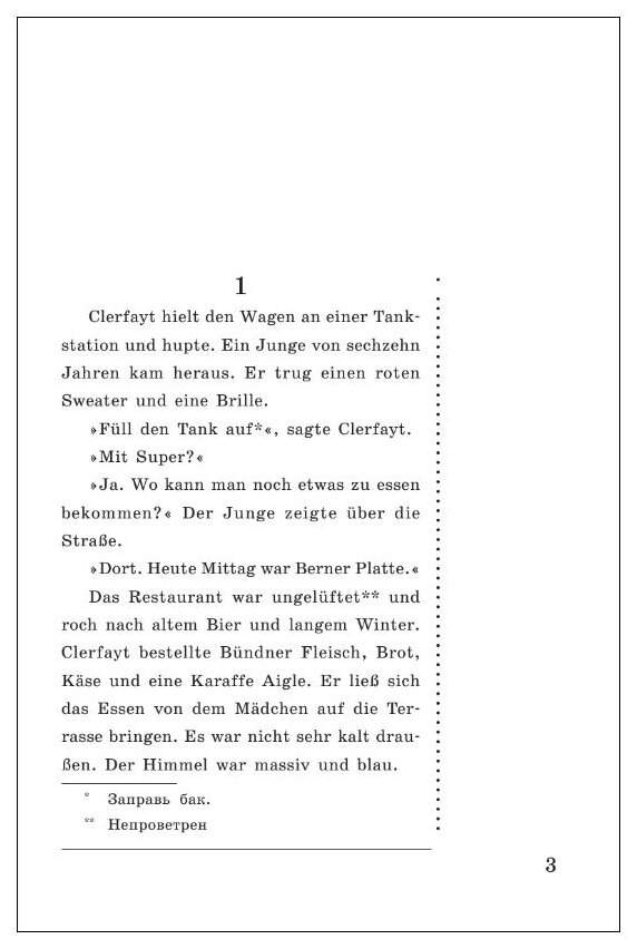 В романе рассказывается история любви автогонщика Клерфэ и молодой девушки Лилиан Дюнкер, больной туберкулезом и уже примирившейся с неизбежностью смерти. Книга о борьбе за жизнь, соревновании со смертью и обретении вечности в любви. Адаптированный текст произведения снабжен лексико-грамматическим комментарием, а также грамматическим справочником. Издание сопровождается словарем.