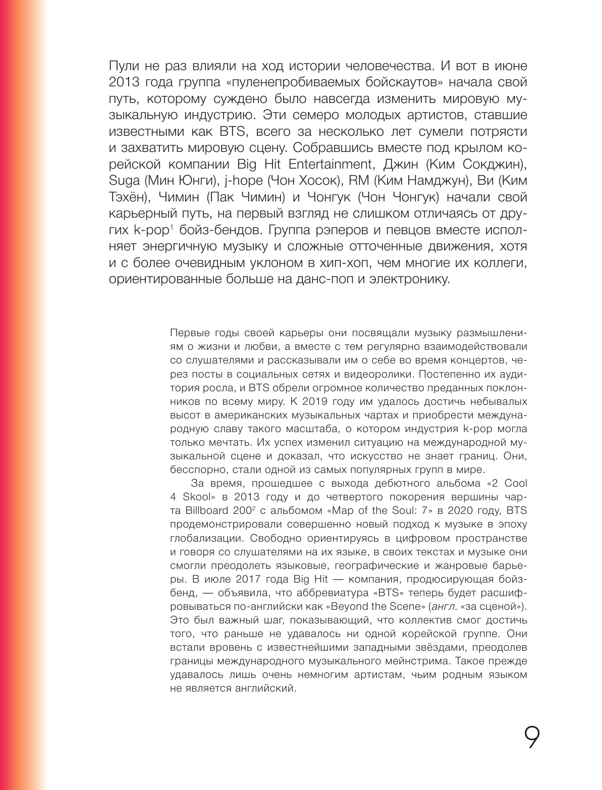 Давно слежу за BTS и их становлением, следила за ними за долго до такой мировой популярности. Невероятно талантливые и трудолюбивые парни, рада, что сейчас они получают заслеженное внимание. Ну а насчет книги, вот аткие книги позволяют увидеть путь артиста, всю изнанку, так сказать – а она порой бывает поразительно жесткой.