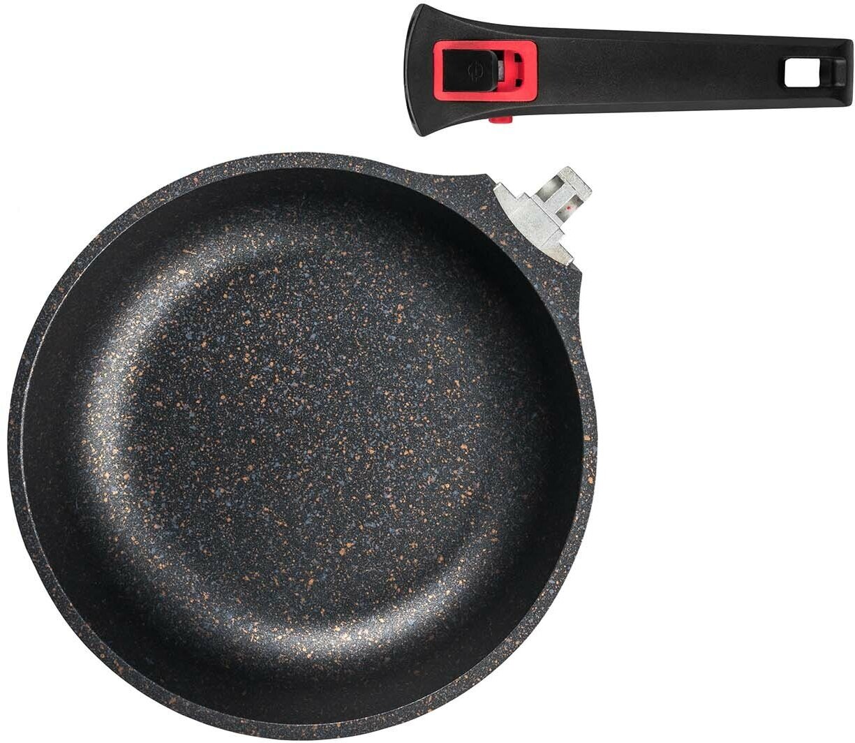 Сковорода сама по себе отличная. Еда не пригорает, очень быстро моется. Ручка прекрасно защелкивается и плотно прилегает - не болтается. Но вес ручки больше веса сковородки, поэтому на газовых плитах опрокидываться может, если пустая. Я теперь ручку отстегиваю сначала, а когда сковороду заполню- тогда и пристегиваю, и всё отлично.