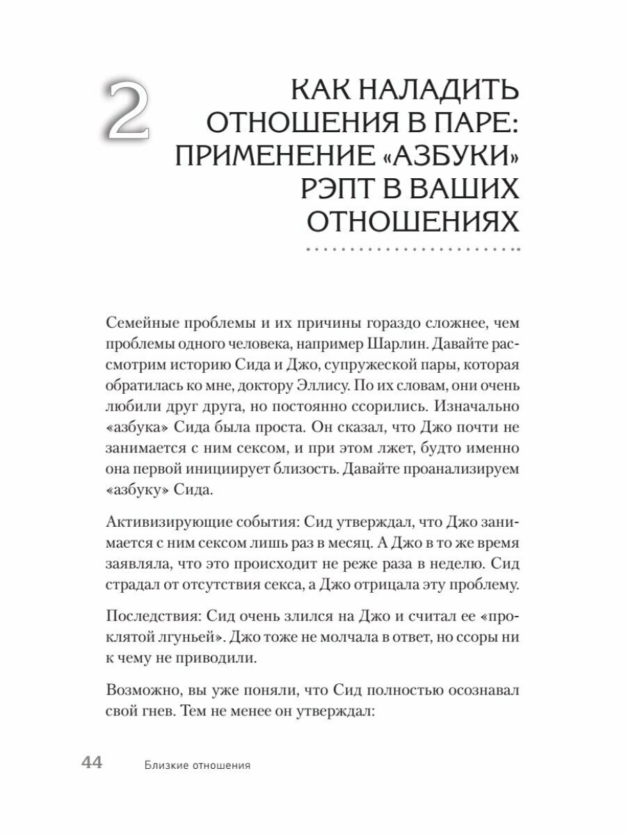 Люди, не желающие признать, что в ситуации виноваты оба партнера, переносят свои проблемы в следующие отношения. Как отмечают в данной книге Эллис и Харпер, легче обвинить другого, чем решать проблемы самому. Читатели, которые надеются с помощью этой книги наладить свои отношения, несомненно, получат результат.