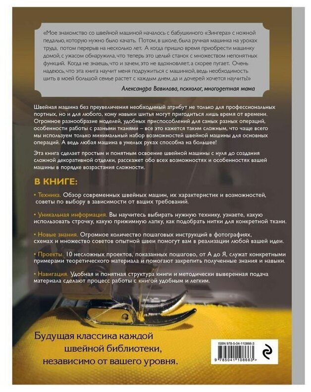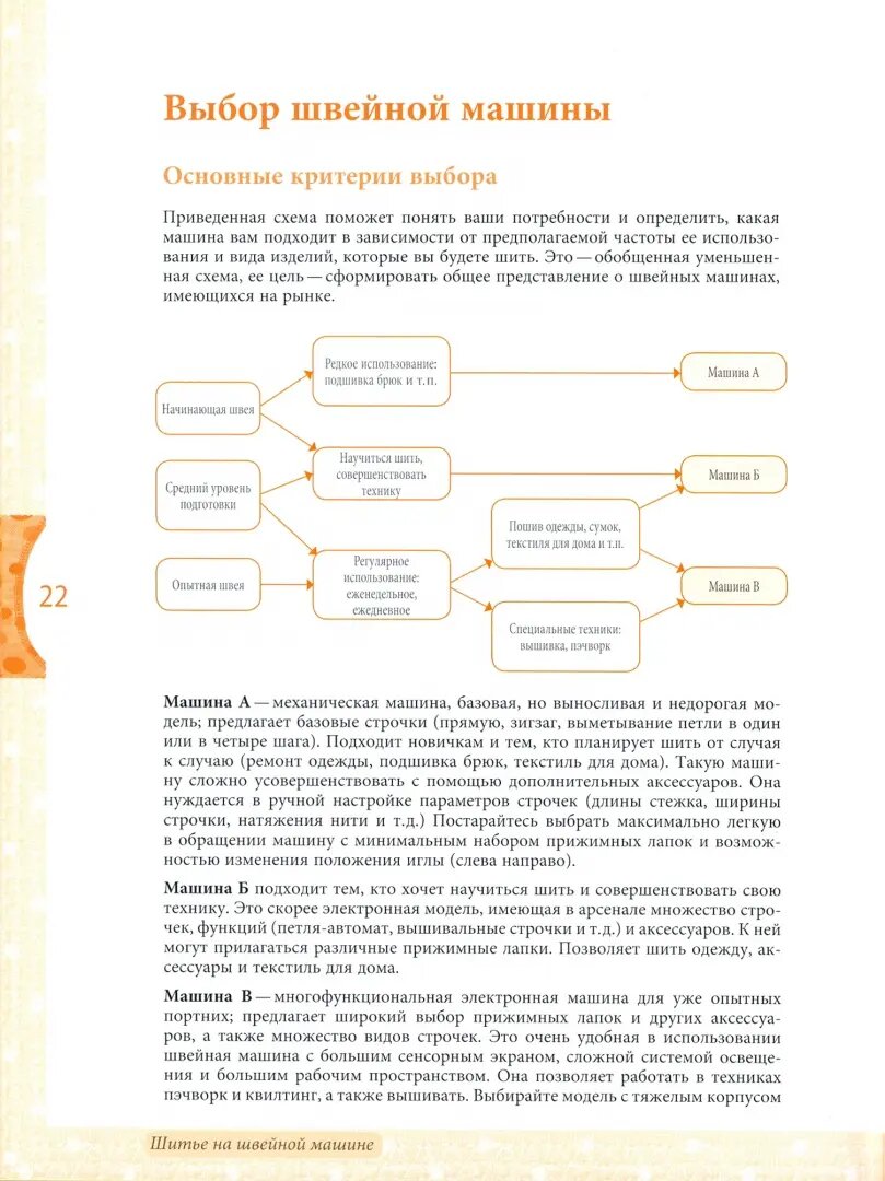 Пожалуй, тот редчайший случай, когда название и содержание максимально точно соответствуют друг другу. Не могу сказать, что ознакомился со всей совеременной литературой по теме шитья на машинке, но приобрёл этого чтива немало, а пролистал ещё больше. Жаль, что эта книга не попалась мне раньше. Избавила бы от лишних трат и вопросов. Искренне рекомендую всем начинающим швейникам-любителям.