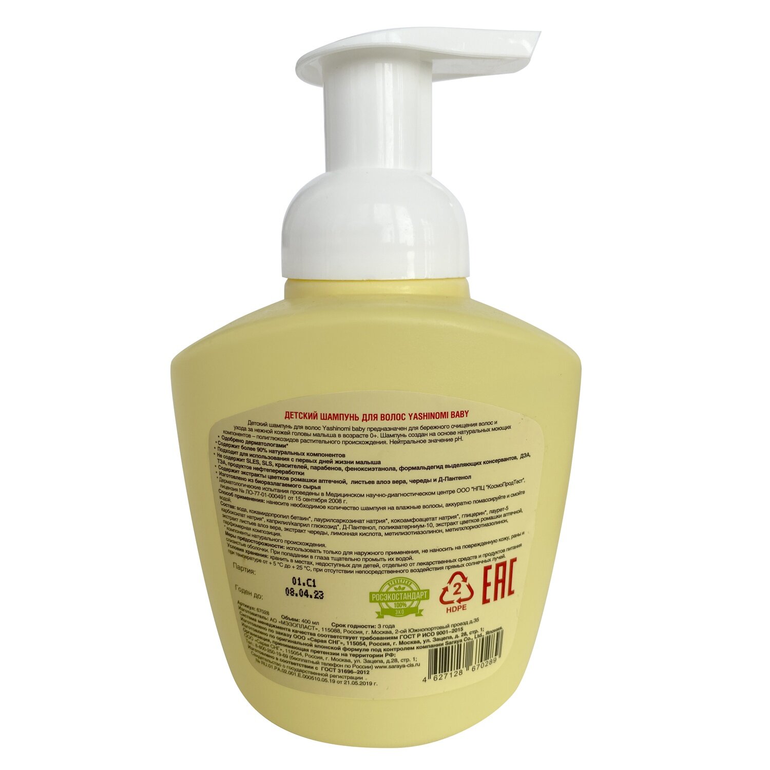Детский шампунь для волос Yashinomi baby предназначен для бережного очищения волос и ухода за нежной кожей головы малыша в возрасте 0+. Шампунь создан на основе натуральных моющих компонентов - полиглюкозидов растительного происхождения. Нейтральное значение pH. Одобрено дерматологами* Содержит более 90% натуральных компонентов. Подходит для использования с первых дней жизни малыша. Не содержит SLES, SLS, красителей, парабенов, феноксиэтанола, формальдегид выделяющих консервантов, ДЭА, ТЭА, продуктов нефтепереработки. Содержит экстракты цветков ромашки аптечной, листьев алоэ вера, череды и Д-Пантенол. Изготовлено из биоразлагаемого сырья.