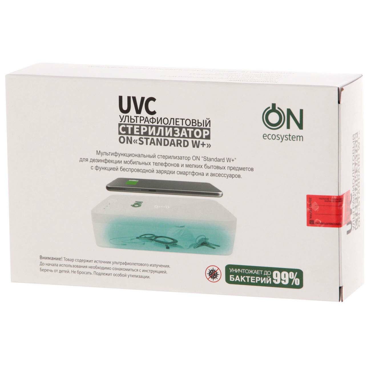 Ультрафиолетовый стерилизатор ON Standard W+ предназначен для дезинфекции и зарядки смартфонов диагональю до 6,9 дюйма с поддержкой технологии QI. Подойдет эта модель и для обработки носимых гаджетов, наушников и других мелких предметов. Цикл дезинфекции длится 5 минут. Светодиодные индикаторы отображают активные режимы (обеззараживание и/или зарядка). Размер прибора 21 х 6 х 14,5 см. Корпус выполнен из сплава поликарбоната и пластика. Подключение к питанию производится при помощи кабеля Type C.