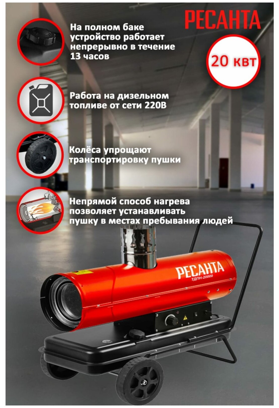 Дизельная тепловая пушка Ресанта ТДПН-20000 предназначена для обогрева больших помещений. За счет непрямого нагрева возможна установка устройства в местах пребывания людей. Металлическая опора обеспечивает устойчивость пушки во время работы. Для удобной транспортировки предусмотрены колеса и ручка. Полного бака достаточно для непрерывной работы пушки в течение 15 часов без дозаправки.