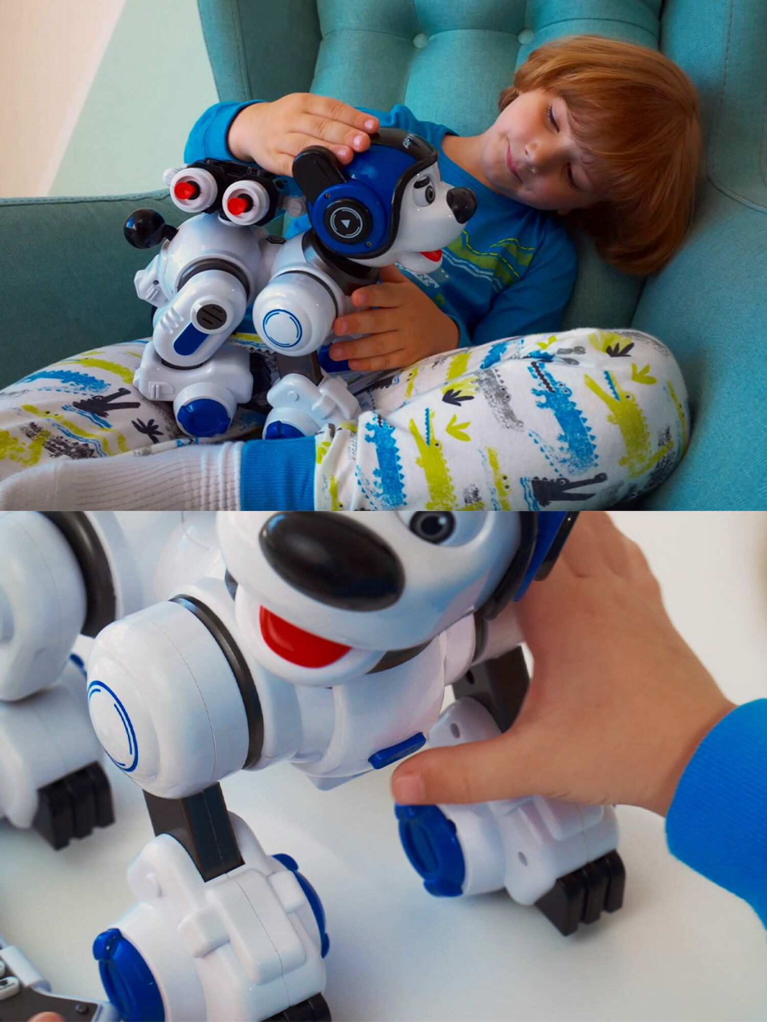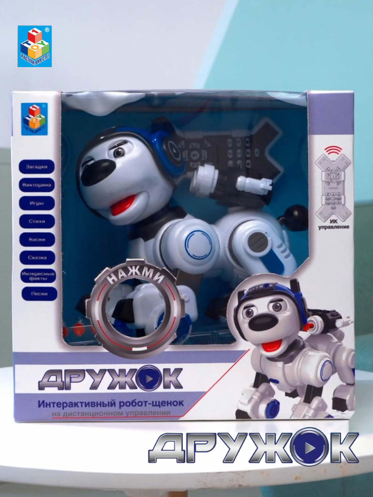 Интерактивный робот щенок Дружок в синем шлеме со стреляющей установкой на спине умеет загадывать 10 загадок, проводить образовательные викторины и интерактивные игры, читает 5 стихотворений, 2 басни, сказку, исполняет 3 оригинальные песенки и рассказывает ребенку познавательные факты о собаках. Игрушка на дистанционном управлении открывает и закрывает глаза, реагирует на прикосновения, поворачивает голову вправо и влево, умеет ходить вперед, назад и поворачивать в разные стороны, танцевать. Управляется дистанционным пультом. Материал – пластик, размер 27х18х25 см.