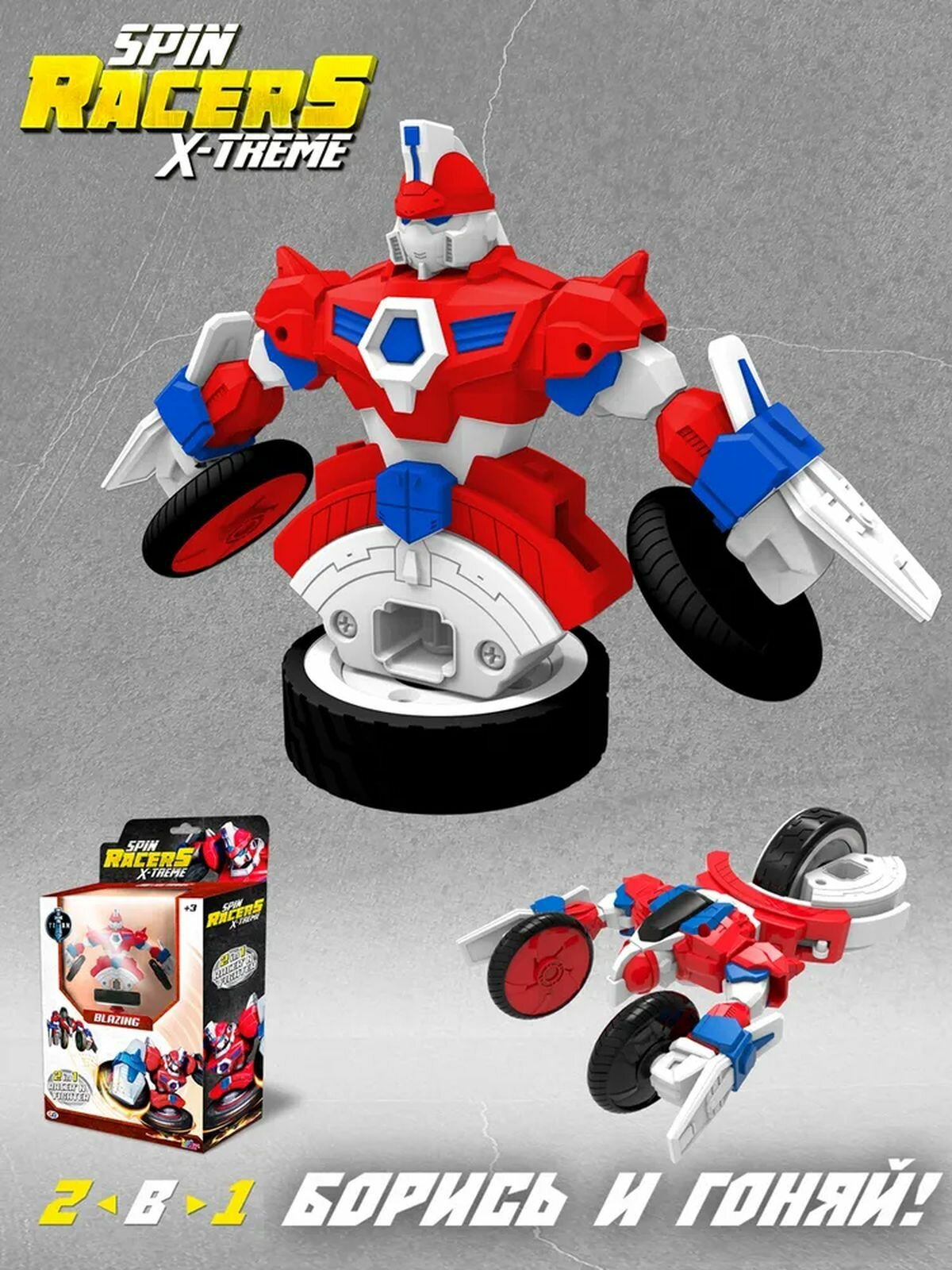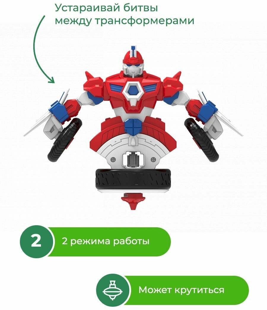 Волчок-трансформер 2 в 1 может функционировать в 2-х режимах: преодолевать расстояние до 15 метров в формате мотоцикла и крутиться вокруг своей оси более 90 секунд.