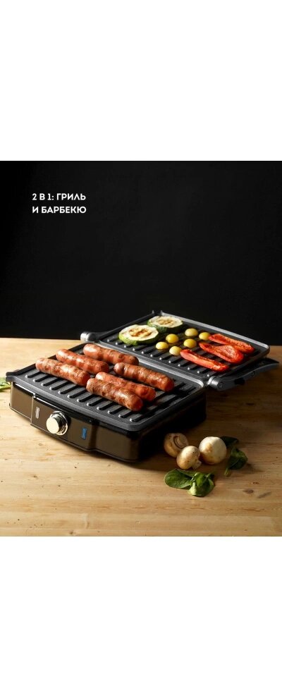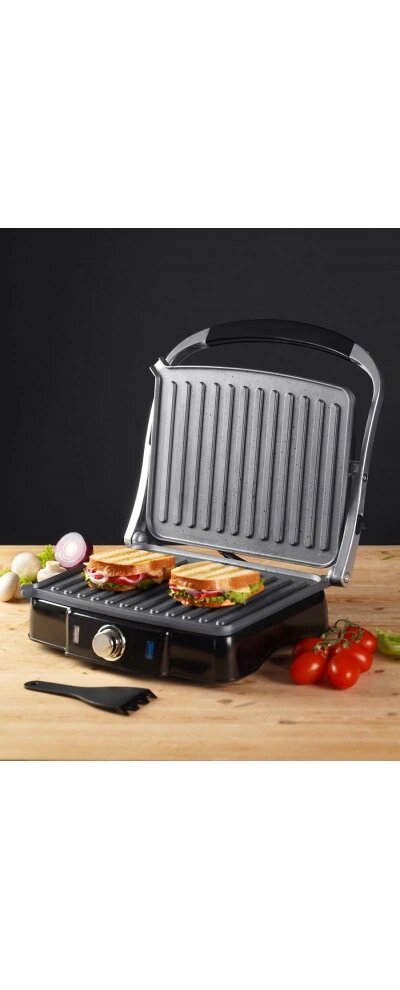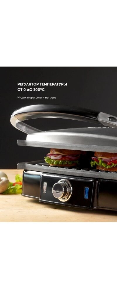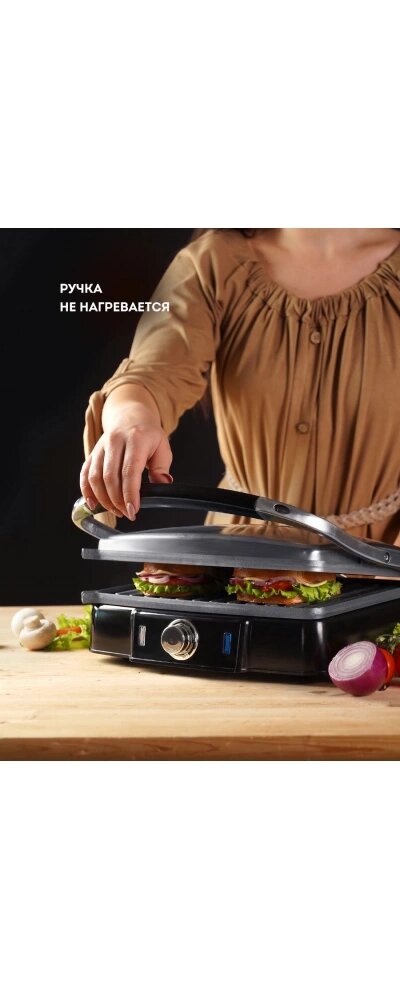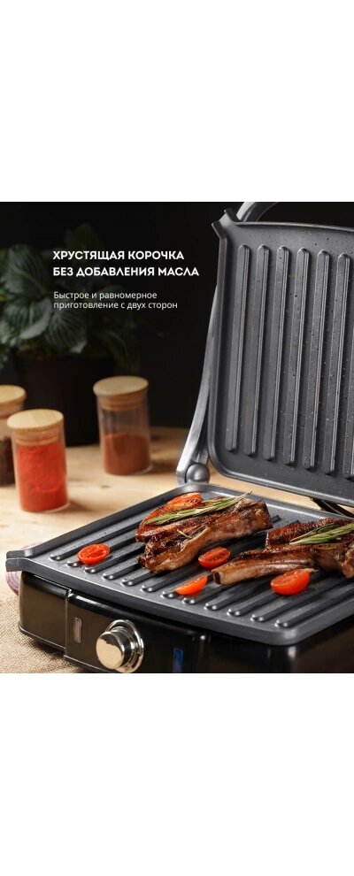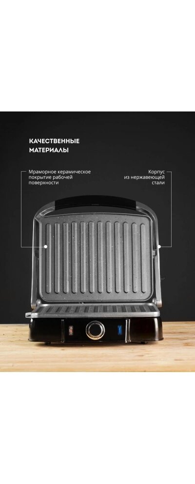 Благодаря уникальному мраморному керамическому покрытию, электрогриль способен готовить без добавления масла, что немаловажно для покупателей, предпочитающих диетическое правильное питание.