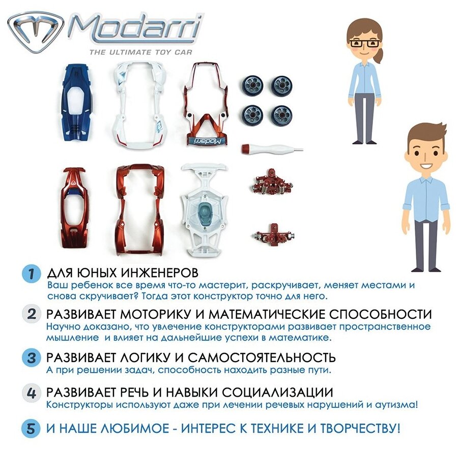 Что вы думаете о Маслкарах? Высокая производительность и мощный двигатель V8? Этот зверь - сила, с которой нужно считаться на любой улице. Создавайте различные варианты, используя дополнительный капот и антикрыло Roadster. Смешивайте и комбинируйте, пока не получите идеальную машину! В нашей модульной строительной системе используются винты, которые не выпадают. Просто ослабьте винты с помощью прилагаемого шестигранного инструмента и замените детали для быстрой и легкой настройки на ходу! В каждом автомобиле Modarri все детали взаимозаменяемы. С 13 сменными деталями в каждом наборе PRO Delux вы можете наслаждаться бесчисленными возможностями дизайна. Настоящая подвеска и механика рулевого управления позволяют вам сесть за руль и получить незабываемые впечатления от гонки или ралли! Выполняйте опасные маневры такие как восьмерки, даже не поворачивая руку!