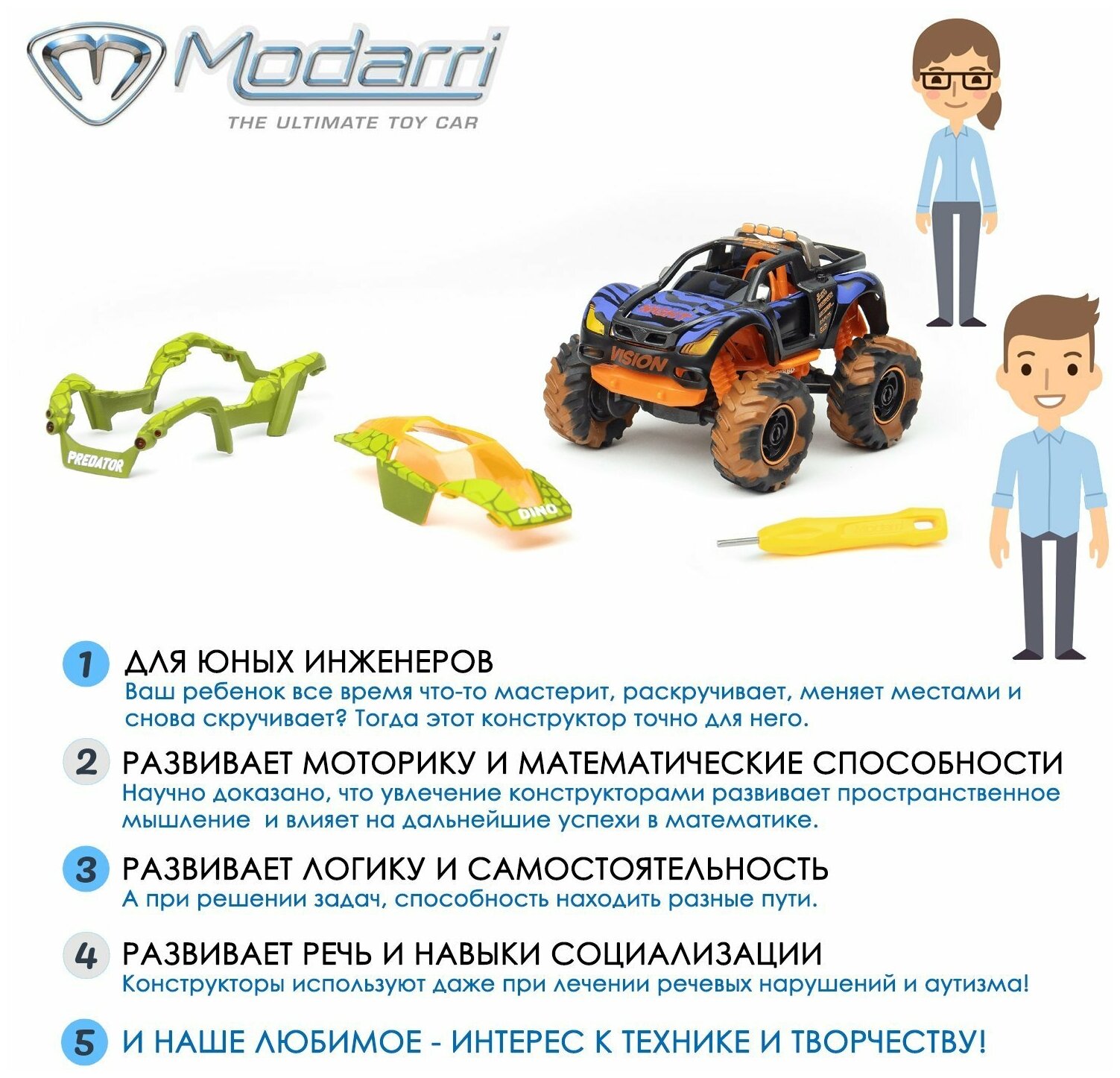 Машинки Modarri-это модульная система, элементы которой универсальны и легко комбинируются. Винтики, используемые здесь, не выпадают. Просто ослабьте их и замените детали. А теперь поставь палец на водительское сиденье и движение машинки под твоим контролем. Создавай тысячи новых дизайнов.