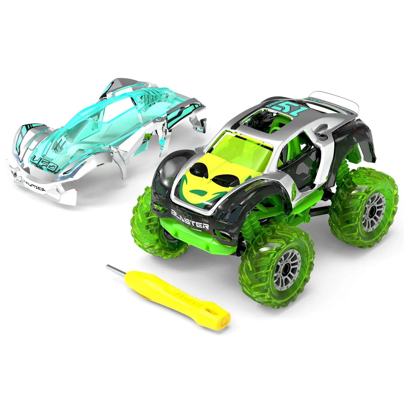В наборе: шасси, кузов, крыло, рама, кузов Hammerhead, крыло Hammerhead, большие шины из мягкой резины и 4 диска (взаимозаменяемы с другими грузовиками), отвертка.