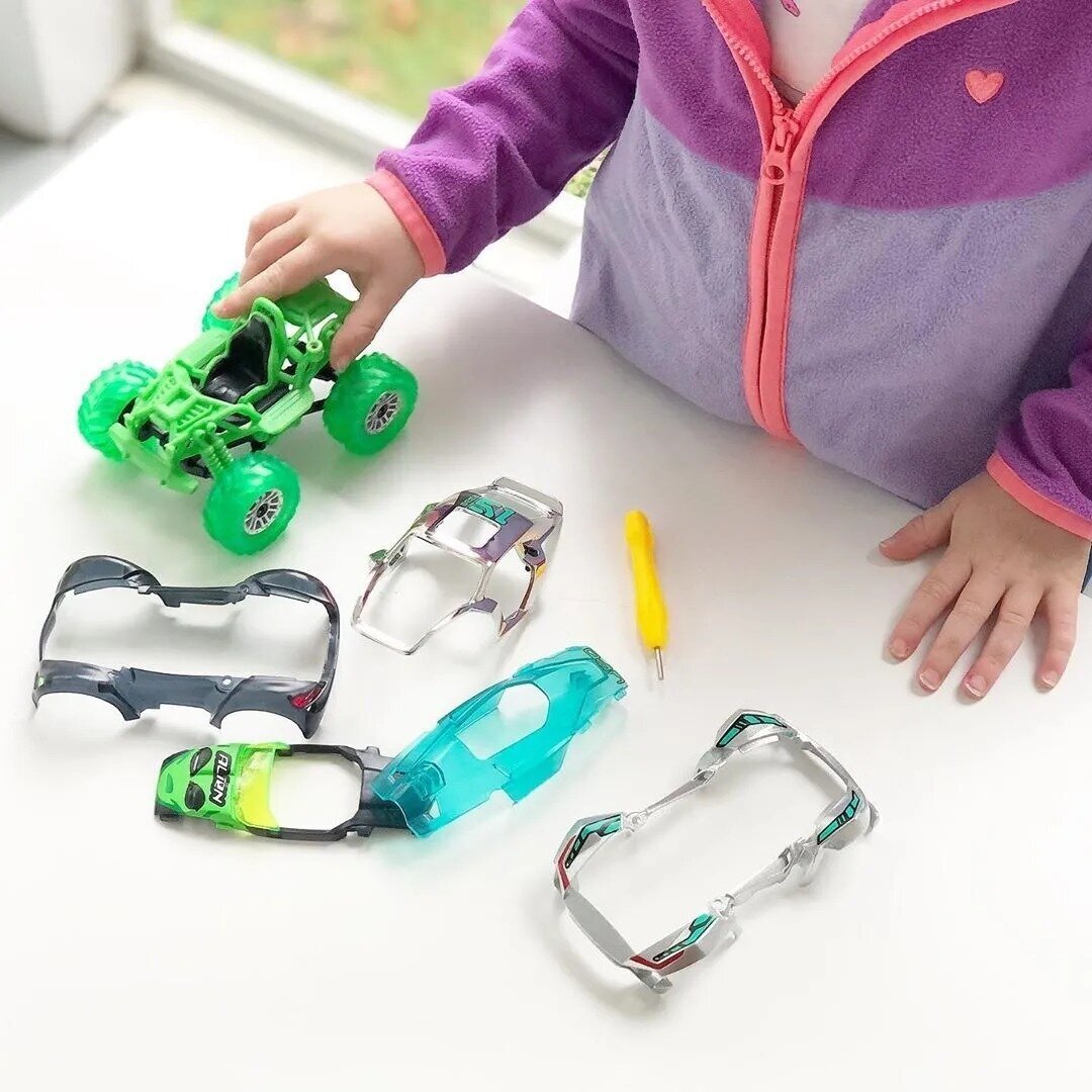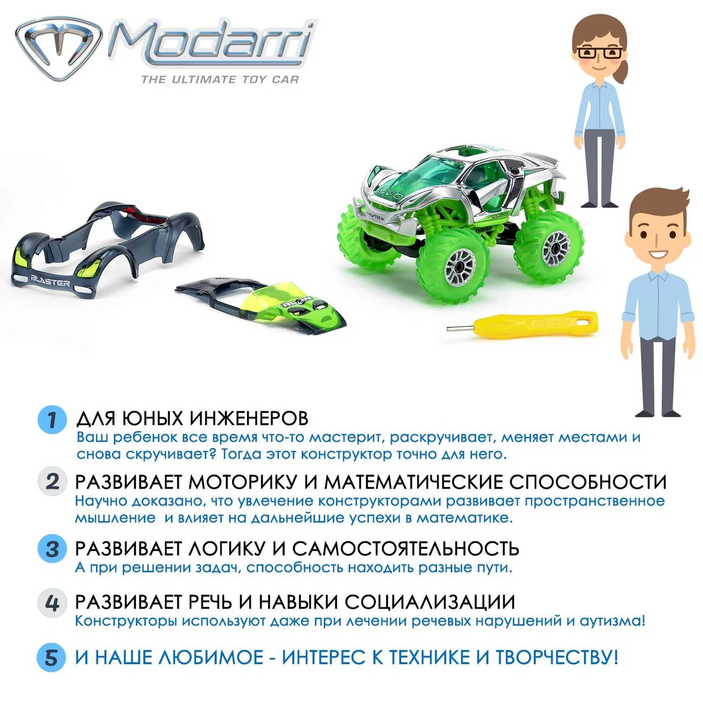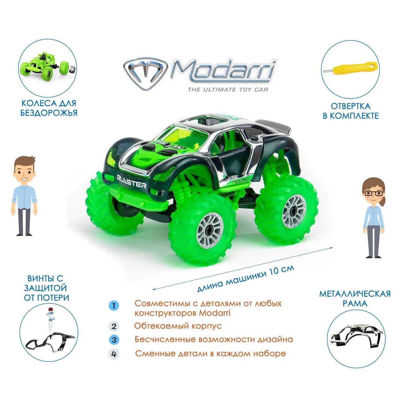 Машинки Modarri-это модульная система, элементы которой универсальны и легко комбинируются. Винтики, используемые здесь, не выпадают. Просто ослабьте их и замените детали. А теперь поставь палец на водительское сиденье и движение машинки под твоим контролем. Создавай тысячи новых дизайнов.