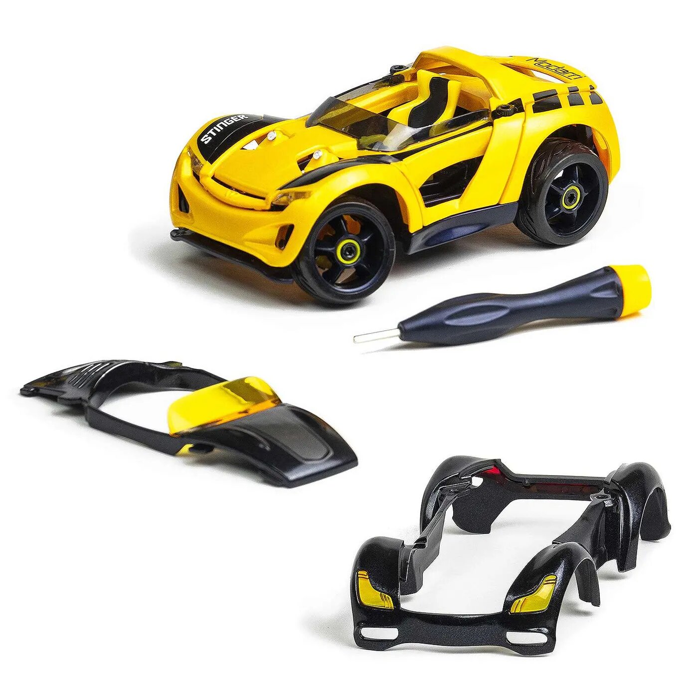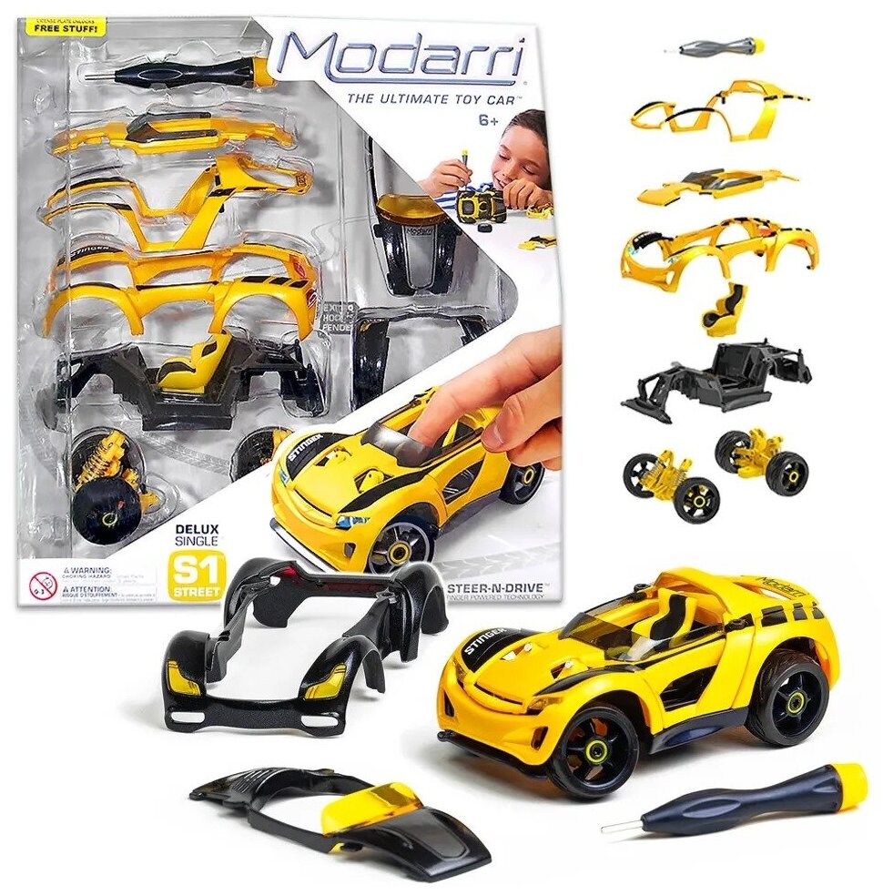В комплекте: воздуховод S1 Metallic Yellow, металлическое желтое уличное антикрыло S1, металлическая желто-черная уличная рама S1, глянцевый черный капот R1 Roadster, глянцевый черный антикрыло родстера R1, передняя и задняя подвеска с уличными колесами, инструмент для сборки автомобиля.