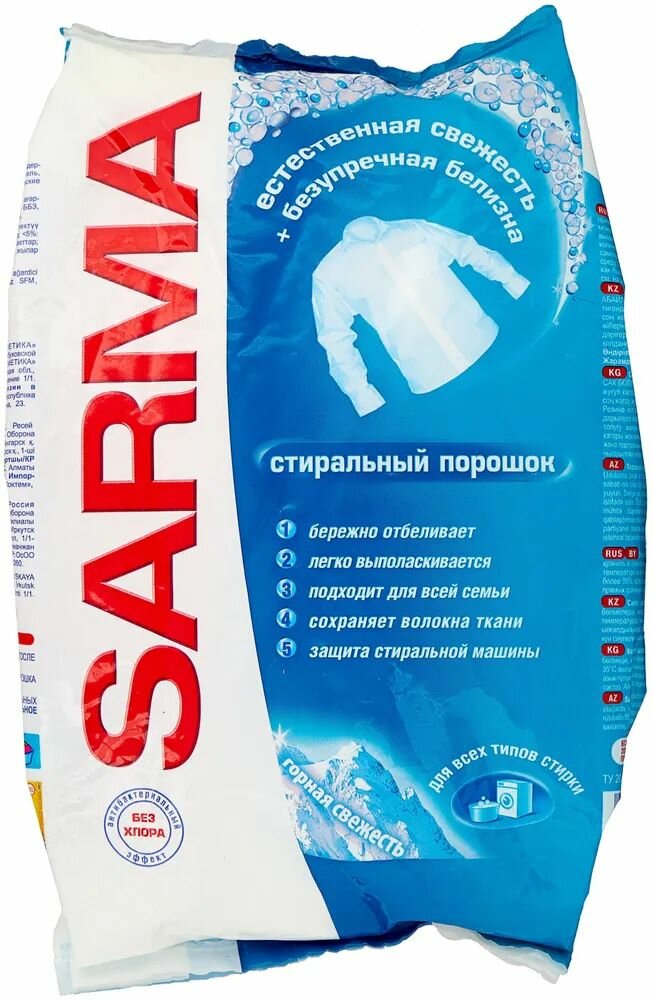 Стральный порошок "Сарма Горная свежесть" предназначен для стирки изделий из хлопчатобумажных, льняных, синтетических и смешанных тканей, в автоматических, активаторных стиральных машинах, а также вручную.