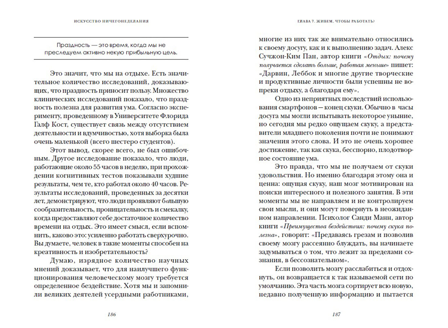Так стоит ли становиться жертвами культа эффективности и буквально убивать себя продуктивностью? Не пора ли просто отдохнуть? Как выяснилось, многие не умеют этого делать, поэтому искусству праздности нужно заново учиться.