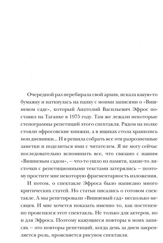 Настоящая книга Аллы Демидовой - особенная. Это приглашение в театр, на легендарный спектакль "Вишневый сад", поставленный А.В. Эфросом на Таганке в 1975 году. Об этой постановке говорила вся Москва, билеты на нее раскупались мгновенно. Режиссер ломал стереотипы прежних постановок, воплощал на сцене то, что до него не делал никто. Раневская (Демидова) представала перед зрителем дамой эпохи Серебряного века и тем самым давала возможность увидеть этот классический образ иначе. Она являлась центром спектакля, а ее партнерами были В. Высоцкий и В. Золотухин.
