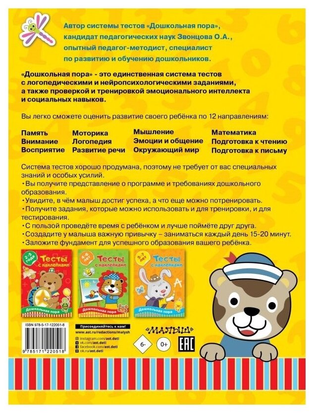 «Дошкольная пора» — система тестов, по которой любой родитель может проверить, что его ребёнку хорошо удается, а над чем ещё можно поработать. Автор книг-тестов — кандидат педагогических наук Звонцова О. А., опытный педагог и специалист по развивающему обучению. В книгах тестов увлекательные вопросы и творческие задания объединены с логопедическими и нейропсихологическими упражнениями, а также проверкой и тренировкой эмоционального интеллекта и социальных навыков. Наклейки увлекают и мотивируют ребёнка к занятиям. В конце книги есть специальный сертификат, который можно подписать и вручить ребенку, как официальную награду за хорошо проделанную работу.