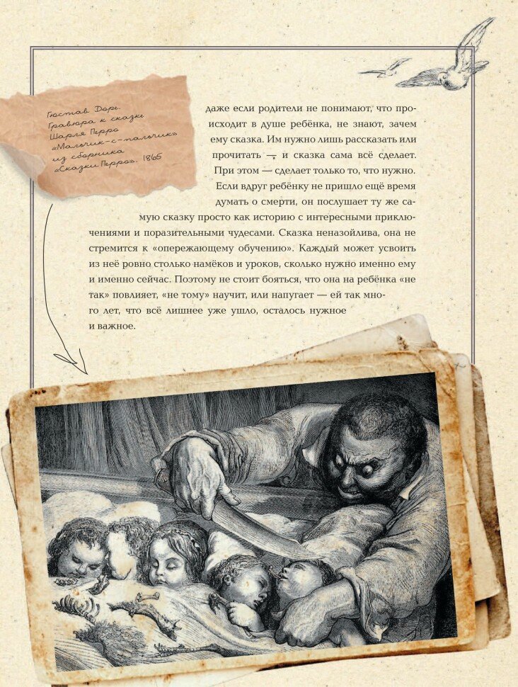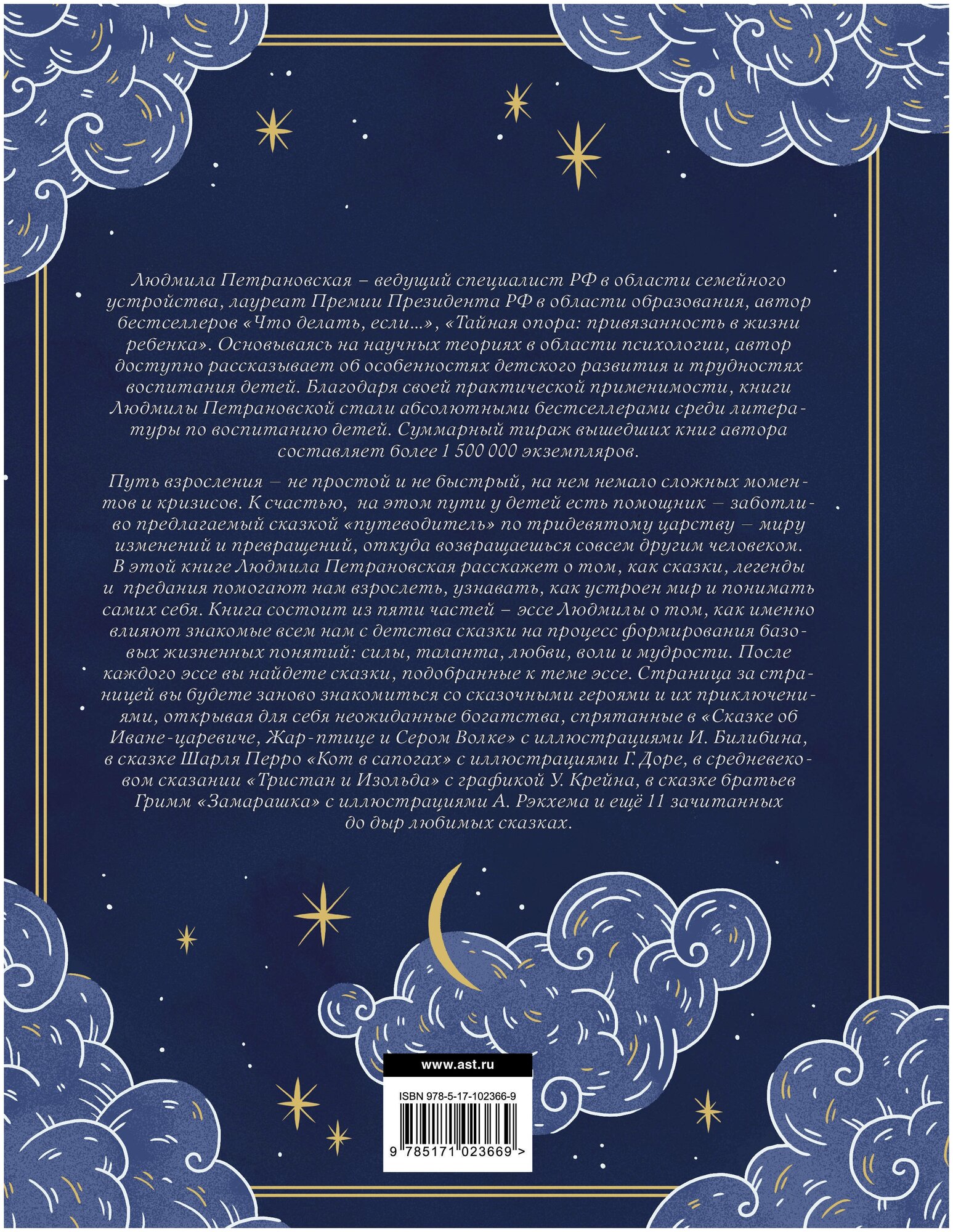 Путь взросления — не простой и не быстрый, на нем немало сложных моментов и кризисов. К счастью, на этом пути у детей есть помощник — заботливо предлагаемый сказкой "путеводитель" по тридевятому царству — миру изменений и превращений, откуда возвращаешься совсем другим человеком. В этой книге Людмила Петрановская расскажет о том, как сказки, легенды и предания помогают нам взрослеть, узнавать, как устроен мир и понимать самих себя. Книга состоит из пяти частей – эссе Людмилы о том, как именно влияют знакомые всем нам с детства сказки на процесс формирования базовых жизненных понятий: силы, таланта, любви, воли и мудрости. После каждого эссе вы найдете сказки, подобранные к теме эссе. Страница за страницей вы будете заново знакомиться со сказочными героями и их приключениями, открывая для себя неожиданные богатства, спрятанные в "Сказке об Иване-царевиче, Жар-птице и Сером Волке" с иллюстрациями И. Билибина, в сказке Шарля Перро "Кот в сапогах" с иллюстрациями Г. Доре, в средневековом сказании "Тристан и Изольда" с графикой У. Крейна, в сказке братьев Гримм "Замарашка" с иллюстрациями А. Рэкхема и ещё 11 зачитанных до дыр любимых сказках.