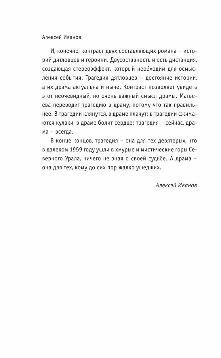 Книга Матвеевой безусловно захватывающее чтение, но концовка немножко разочаровывает. Начало обещало большего. Если уж дятловцы каким-то мистическим образом вышли на связь с главной героиней, то должны были, рассуждая логически, поведать все тайны до конца. Думаю, что книга будет интересна и тем читателям, кто хорошо знаком с темой гибели группы Дятлова, и тем, кто этой темой никогда не интересовался. Возможно для последних знакомство с романом станет началом для личного исследования этой самой загадочной истории 20 века.