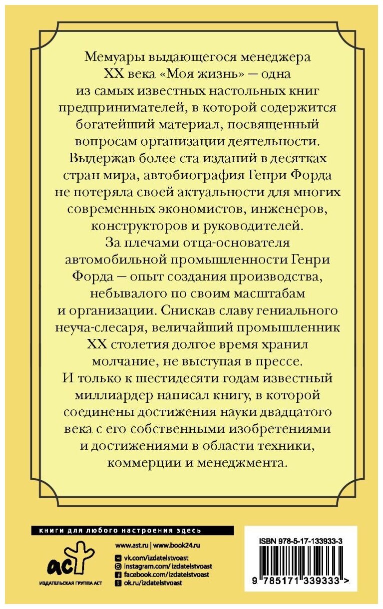 Мемуары выдающегося менеджера XX века "Моя жизнь" — одна из самых известных настольных книг предпринимателей, в которой содержится богатейший материал, посвященный вопросам организации деятельности. Выдержав более ста изданий в десятках стран мира, автобиография Генри Форда не потеряла своей актуальности для многих современных экономистов, инженеров, конструкторов и руководителей. За плечами отца-основателя автомобильной промышленности Генри Форда — опыт создания производства, небывалого по своим масштабам и организации. Снискав славу гениального неуча-слесаря, величайший промышленник XX столетия долгое время хранил молчание, не выступая в прессе. И только к шестидесяти годам известный миллиардер написал книгу, в которой соединены достижения науки двадцатого века с его собственными изобретениями и достижениями в области техники, коммерции и менеджмента.