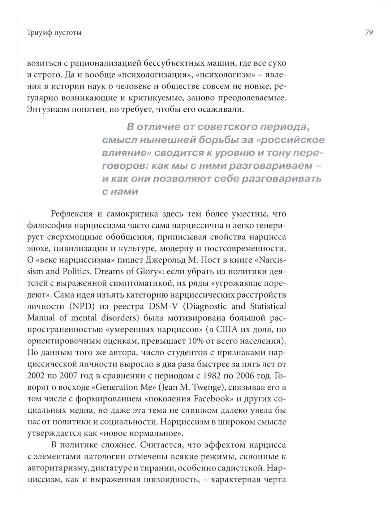 Книга посвящена принципиально новой для нас теме политического нарциссизма. Явление, многим кажущееся знакомым и достаточно маргинальным, оборачивается одной из фундаментальных проблем всего нашего времени - эпидемией нарциссизма и династий нарциссов, "чумой XXI века" и психологическим ядром постмодерна. В политике это проблема отнюдь не только злокачественной патологии лидеров. Это и массовые расстройства фиксации на грандиозности и всемогущественности политического целого. Нарциссизм компенсирует бытовые комплексы, но при этом отвлекает от решения реальных проблем. То, что в людях мы воспринимаем лишь как забавную и в целом безобидную черту характера, в психоистории чревато масштабными трагедиями. Нарциссическое самолюбование целых стран сопровождается развалом базовых систем жизнеобеспечения: экономики, технологий, инфраструктуры. Связь нарциссизма с влечением к смерти не придумана философами, и смерть Нарцисса от голода - не случайная деталь красивого мифа.