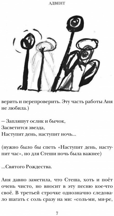 "Есть такие праздничные коробки с открывающимися окошечками, за которыми прячут лакомства. "Адвент" похож на такую рождественскую коробку. Открываются окошки - а за ними люди, каждый со своей историей, каждый со своим сюжетом. Люди эти как будто ещё не вполне настоящие: им только предстоит стать живыми в ожидании Рождества. И мир вокруг озябший и тёмный, как гравюра, и время призрачно. Но люди смеются - в своих окошках - то смехом ангельским, то безудержным, то отчаянным. И удивительным образом смех этот как-то формирует сюжеты, делает истории светящимися, блестящими ёлочными шарами".