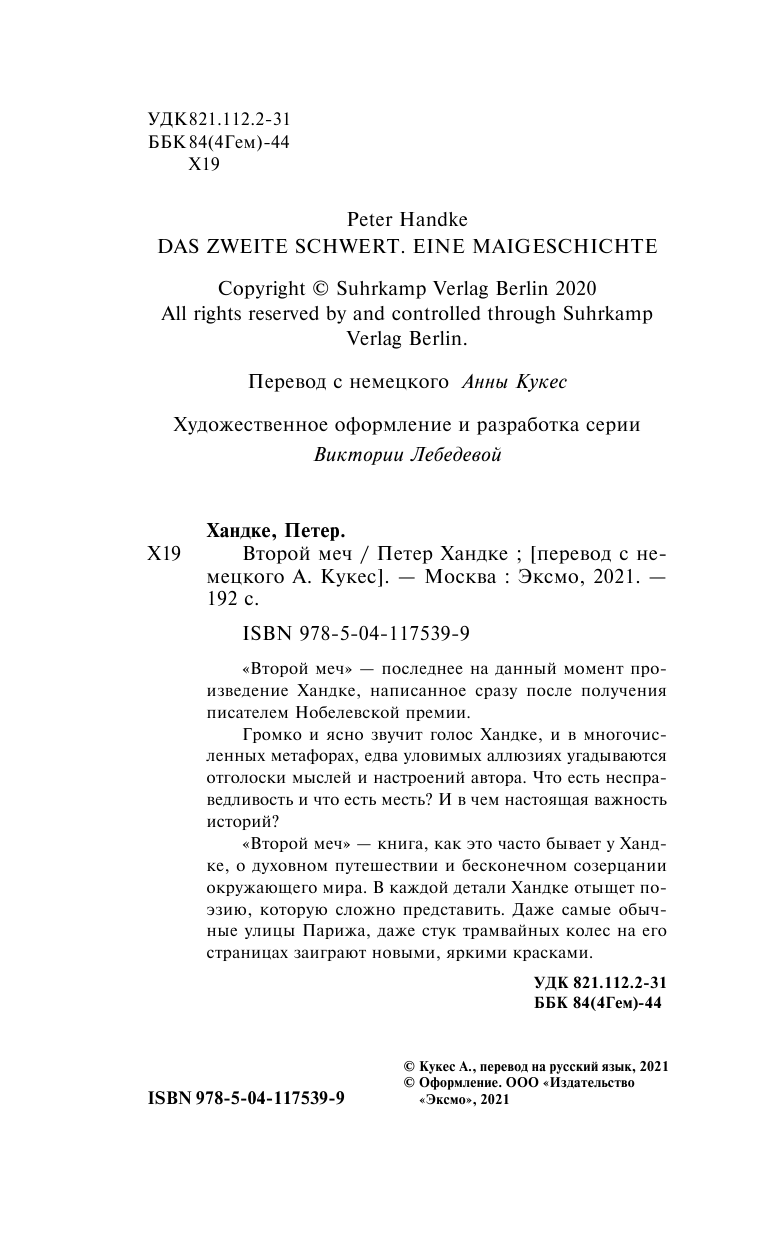Книга: Второй меч (Петер Хандке); Эксмо, Inspiria, Редакция 1, 2021