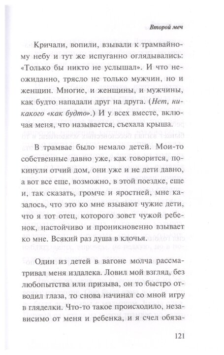 "Второй меч" — книга, как это часто бывает у Хандке, о духовном путешествии и бесконечном созерцании окружающего мира. В каждой детали Хандке отыщет поэзию, которую сложно представить. Даже самые обычные улицы Парижа, даже стук трамвайных колес на его страницах заиграют новыми, яркими красками.