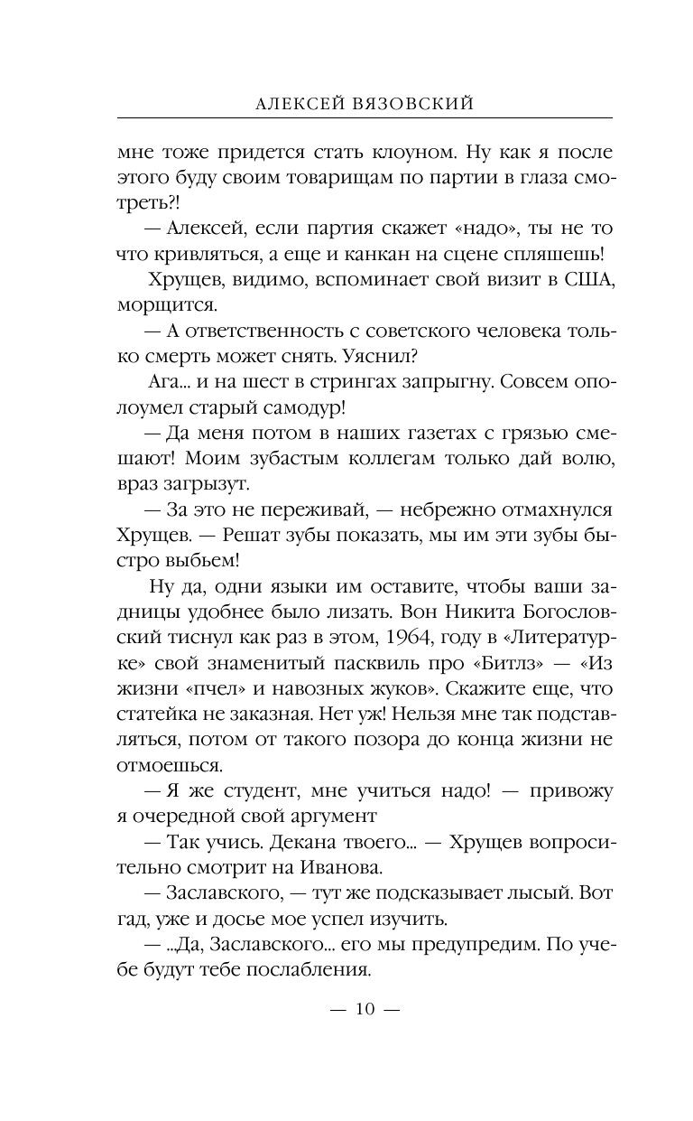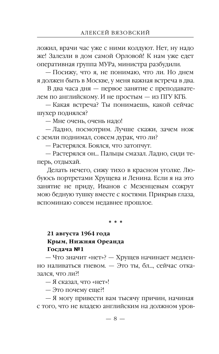 Прочитал всю книгу в первый день появления. Согласен с предыдущим автором отзывов: темп повествования повысился, а то иногда скука одолевала. И конец интригующий, имеет смысл ждать продолжения. Некоторые нити предыдущих развитий событий куда то потерялись, про месть воров -ни слова. Абсолютна непонятна инертность прохрущевских сил после разгрома первой попытки его отстранения. Но без этого и интрига бы не появилась. Серия найдет читателя, а герой – победит!