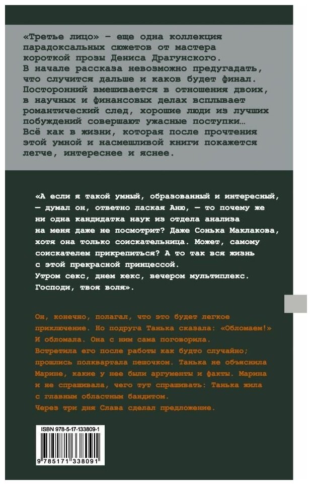 "Третье лицо" - еще одна коллекция парадоксальных сюжетов от мастера короткой прозы Дениса Драгунского. В начале рассказа невозможно предугадать, что случится дальше и каков будет финал. Посторонний вмешивается в отношения двоих, в научных и финансовых делах всплывает романтический след, хорошие люди из лучших побуждений совершают ужасные поступки… Всё как в жизни, которая после прочтения этой умной и насмешливой книги покажется легче, интереснее и яснее.