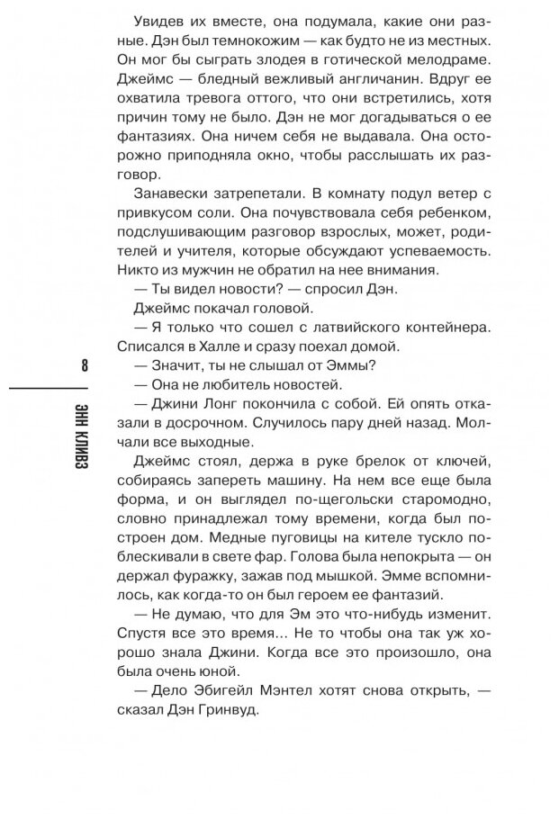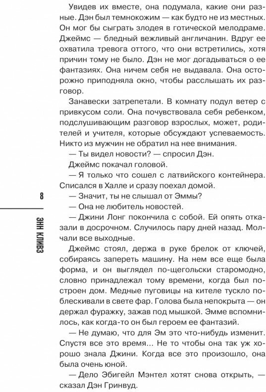 И тут у меня возникает претензия к автору: если это психологический детектив, тут должен быть, собственно говоря, психологизм. Но каждый раз, когда речь заходит про мотивацию убийцы и то, как было совершено преступление, рассказ становится вялым и несколько неправдоподобным. Будто Энн Кливз предлагает поверить ей на слово, а преступник – ну его, нехороший он человек, поэтому и говорить нечего. Поэтому каждая концовка каждой книги смазанная и невнятная.