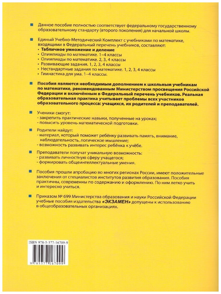 Данное пособие полностью соответствует федеральному государственному образовательному стандарту (второго поколения) для начальной школы. В книге представлен материал, который позволит, с одной стороны, за короткое время выучить таблицу умножения, с другой - эффективно тренировать устойчивость внимания, оперативную память детей, умение сосредотачиваться. Дети, работая с пособием, научатся быстро и правильно умножать числа, выполнять обратные математические операции с натуральными числами. Для учителя данный материал является хорошим инструментом диагностики причин затруднений каждого ученика. Пособие предназначено для учащихся, учителей начальной школы и родителей, которые хотят помочь своим детям в освоении математики, преодолеть трудности в освоении программы.
