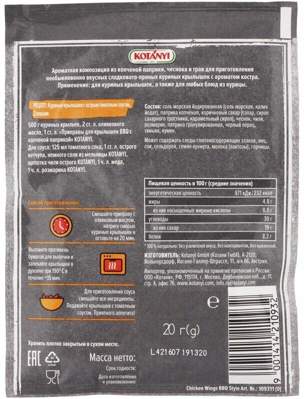| Состав | Соль морская йодированная (соль морская, калия йодид), паприка копченая, коричневый сахар (сахар, сироп сахарного тростника, карамельный сироп), чеснок, чили, розмарин, паприка гранулированная, перец, тимьян, кумин |