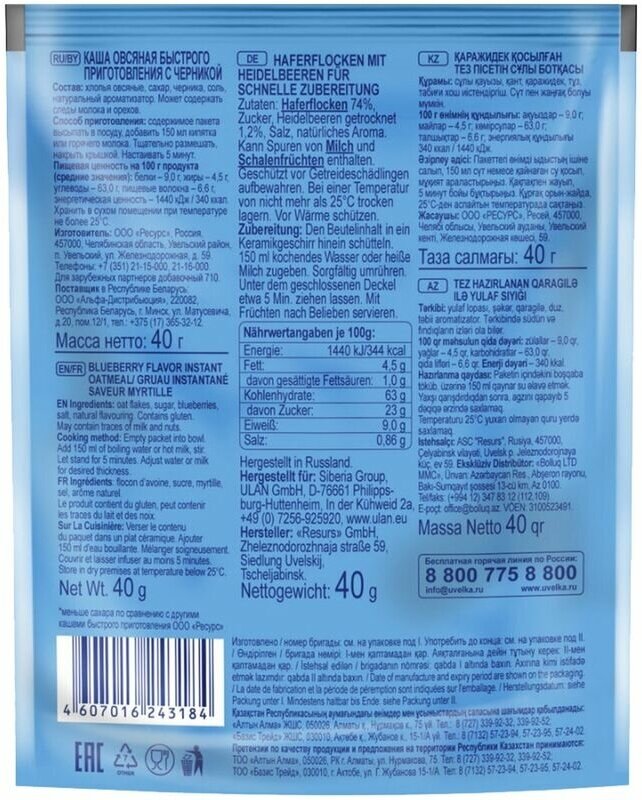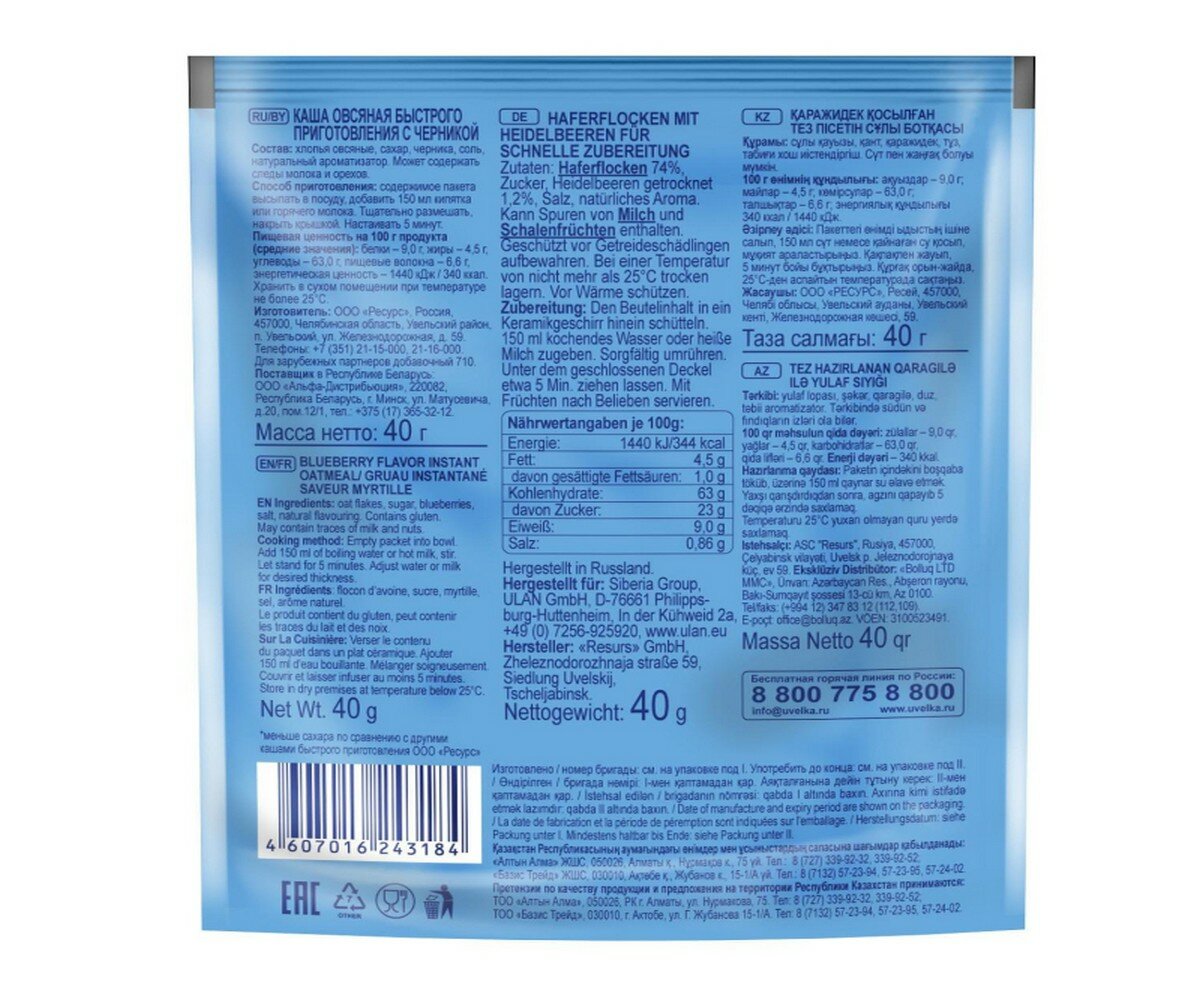 Каша овсяная Увелка Черника 40г РЕСУРС