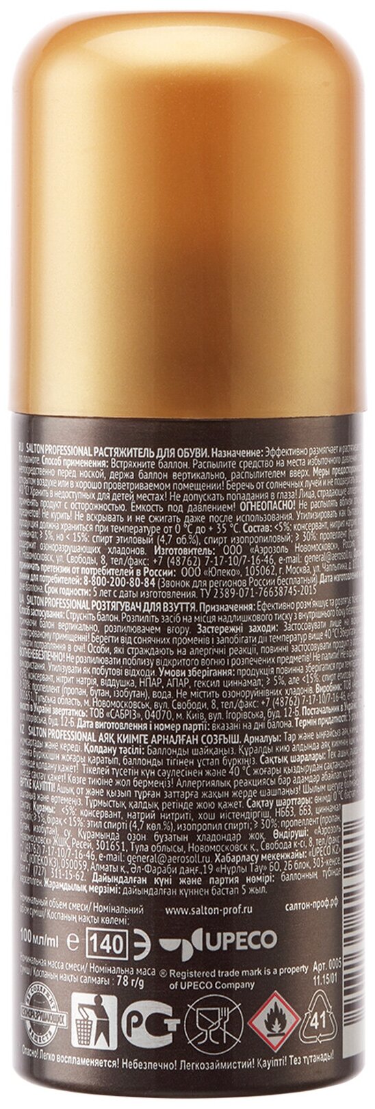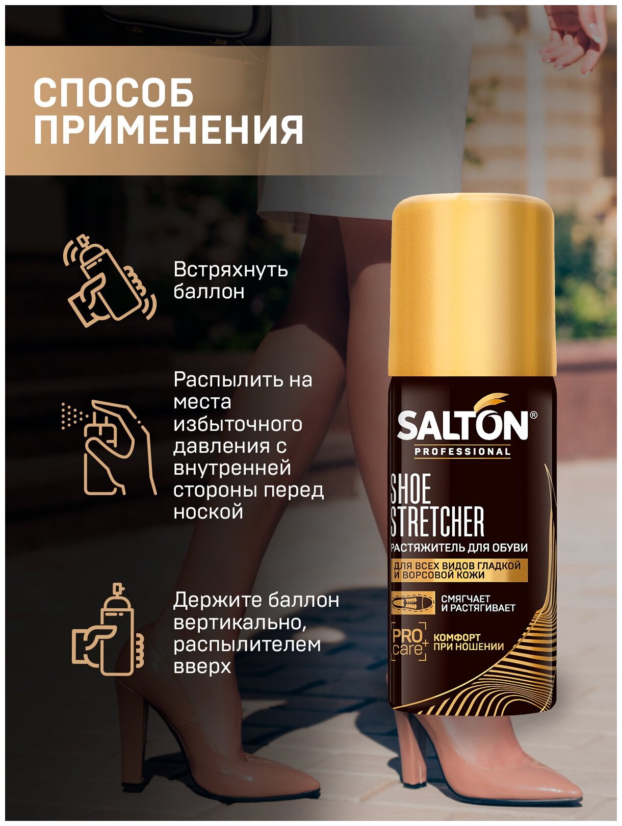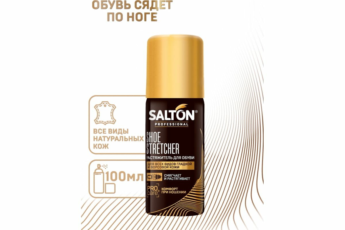 Все мы знаем, что обувь прежде всего должна быть удобной и комфортной. Но как отказаться от покупки модных узких лодочек или блестящих лаковых ботинок? Не ходить же все время в удобных кроссовках? Конечно, нет. Для того, чтобы любая обувь стала для Вас комфортной и не доставляла дискомфорт при носке попробуйте растяжитель для обуви Salton Professional. Это средство для обуви подходит для всех видов натуральной кожи. Профессиональная пена-растяжитель для обуви Salton разработана по специальной технологии и содержит исключительно деликатные компоненты. Благодаря этим компонентам средство размягчает и растягивает обувь по полноте до нужного состояния и фиксирует кожу, не повреждая ее структуру. C растяжителем для обуви Salton Professional любая пара обуви сядет по ноге и будет носиться легко и комфортно!