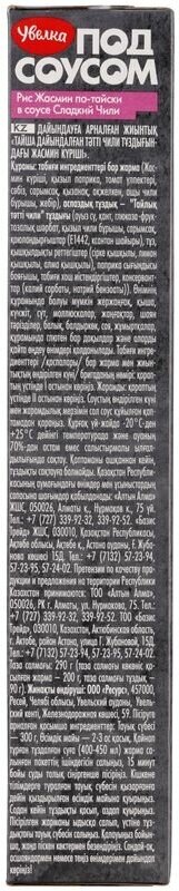 Состав: Крупа с натуральными ингредиентами: рис Жасмин, паприка красная молотая, томат хлопья, морковь, чеснок, петрушка, перец чили острый дробленый, тимьян. Продукт может содержать незначительное количество глютена. Соус кулинарный –соус «Тайский Сладкий чили»: Вода питьевая, сахар, глюкозно-фруктозный сироп, перец красный чили, чеснок, загустители (Е1442, ксантановая камедь), соль, регуляторы кислотности (уксусная кислота, лимонная кислота, яблочная кислота), краситель экстракт паприки, ароматизаторы натуральные, консерванты (сорбат калия, бензоат натрия). На предприятии используются арахис, горчица, кунжут, моллюски, орехи, ракообразные, рыба, сельдерей и продукты их переработки.