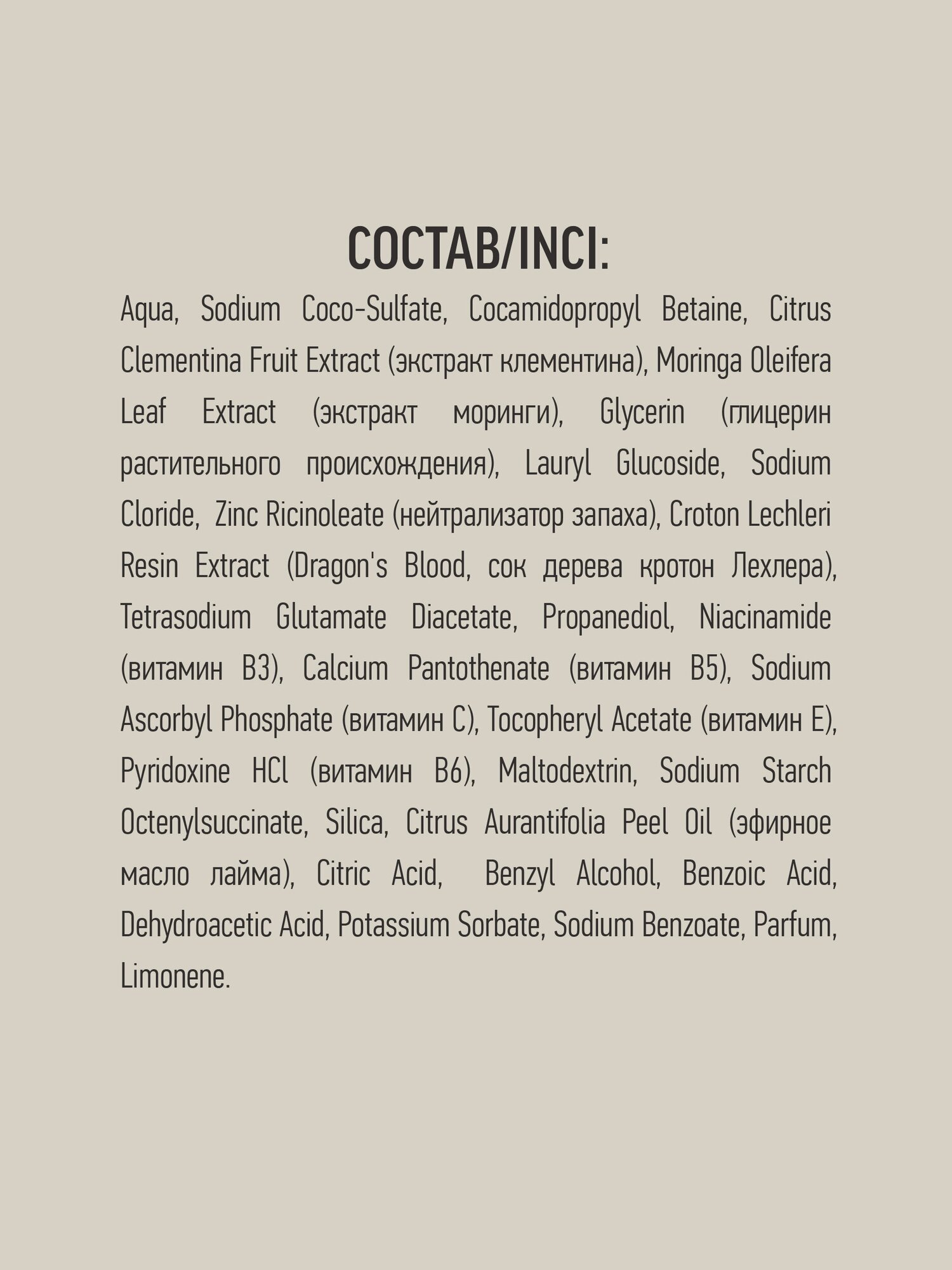 Экстракт климентина деликатно очищает, обладает антиоксидантным действием, способствует оздоровлению кожи, омолаживает, смягчает, способствует сохранению влаги в клетках кожи. Эфирное масло лайма улучшает обменные процессы в клетках кожи, тонизирует и увлажняет, благодаря чему она выглядит красивой и ухоженной. Защищает от преждевременного старения. Сок дерева Кротон Лехлера (Кровь Дракона), экстракт моринги, витамины В5, В6, С, Е стимулируют детокс клеток, регенерируют кожу, проявляют высокую антиоксидантную активность и улучшают барьерные функции кожи.