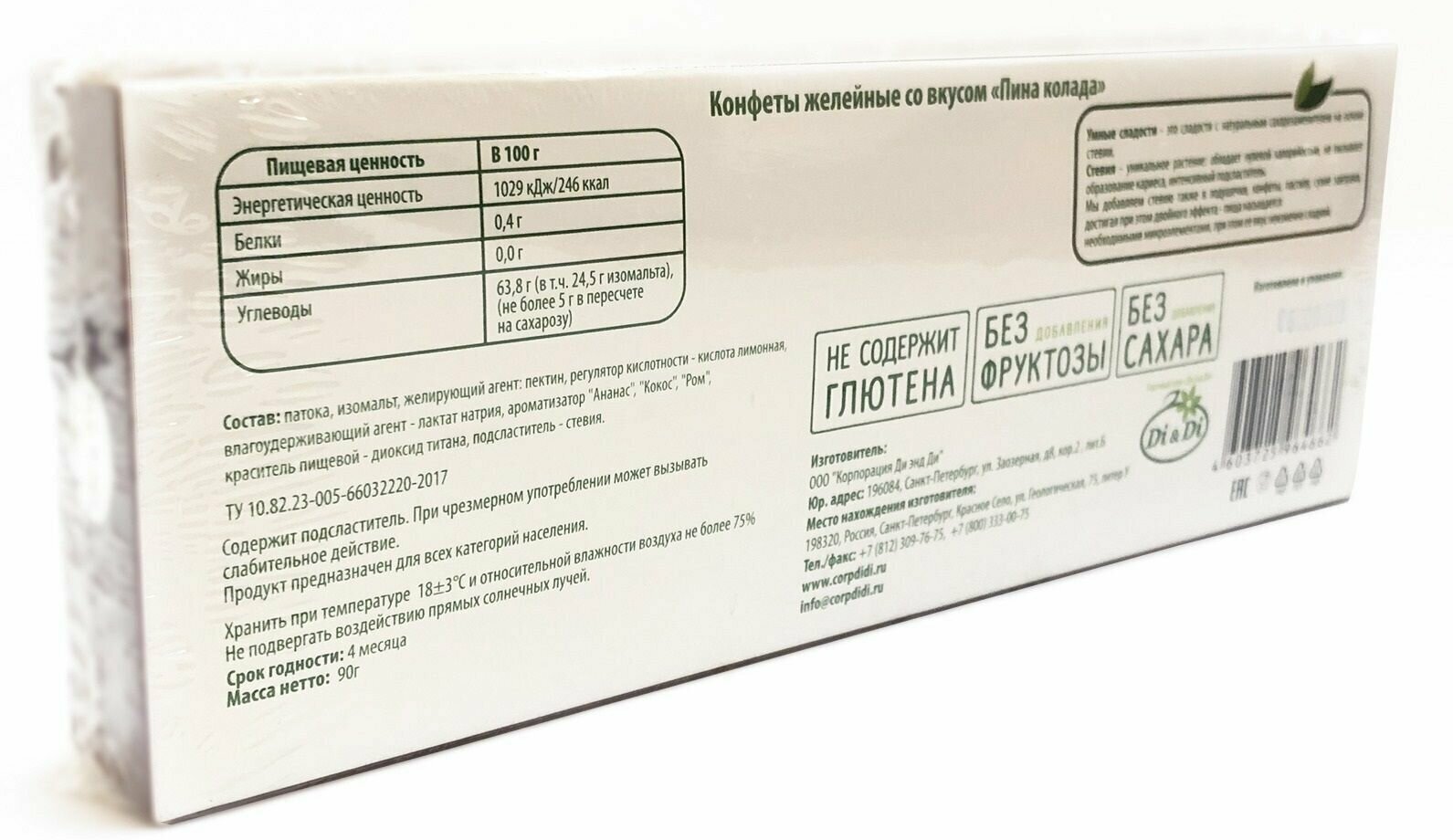 Конфеты желейные со вкусом пина-колада от «Умные сладости» не содержат сахара и глютен. Подходят для диабетиков и людей, следящими за своим питанием. Конфета с полезным составом скрасит своими вкусовыми качествами ваше чаепитие.
