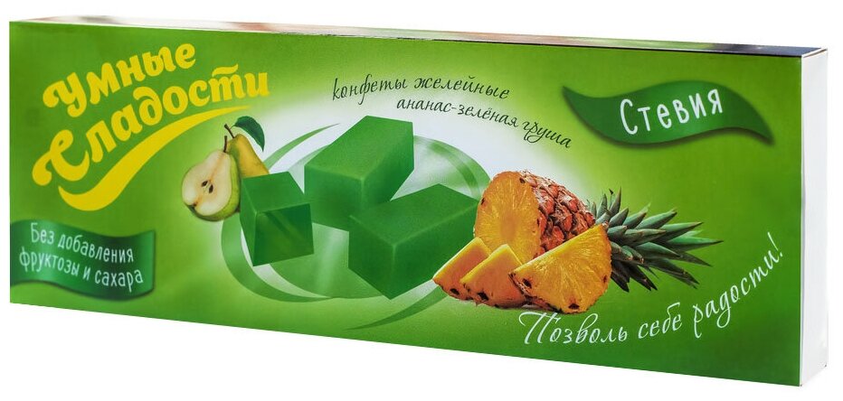 Ароматные желейные конфеты без сахара и глютена со вкусом ананас-зеленая груша удивят вас потрясающим вкусом! Сладкие, но без сахара, они не нанесут вреда вашему организму и поднимут настроение!В составе конфет используются только натуральные подсластители - изомальт и стевия. Стевия - натуральный сахарозаменитель из листьев одноименного растения. Многочисленными исследованиями доказано, что стевия низкокалорийна и обладает богатым химическим составом. Изомальт - низкокалорийный растительный заменитель сахара. Он сладкий на вкус, но при этом в нем содержится в 2 раза меньше калорий, чем в сахаре. Пектин в основе желе является природным энтеросорбентом, который способствует очищению кишечника от шлаков. Конфеты "Умные сладости" желейные без сахара и глютена - не только прекрасное дополнение к чаю, но и вкусный и полезный десерт для гурманов. Идеально подойдет для диеты. Правильное решение для здорового перекуса, в детский сад, в школу, на работу, прогулку, любой праздник- на 8 марта, 23 февраля, на день учителя, новый год для девочки, мальчика, маме, для детей, коллеге, любимой вкусные подарки. В ассортименте есть подарочная коробка конфет. Для диабетиков, после предварительной консультации с врачом. Подходят под веганский продукт, постные продукты, для похудения, с подсластителем, пп, правильное питание. Мармеладные конфеты со стевией в линейке имеются разные вкусы: малина, пина- колада, лимон, вишня, манго - маракуйя, роза, ананас, в шоколаде. ассорти. Десерт отличная замена сладким вкусняшкам и продуктам питания с сахаром и фруктозой. Еда, зож, веган, новогодние, жевательные конфеты, вкусный подарок, без сахара и глютена, эко, натуральные, необычные живые конфеты, упаковка, польза.
