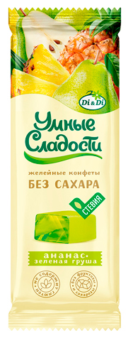 | Состав | патока, изомальт, загуститель-пектин, регулятор кислотности-кислота лимонная, влагоудерживающий агент-лактат натрия, ароматизатор «ананас», «зеленая груша», краситель пищевой, подсластитель-стевия |