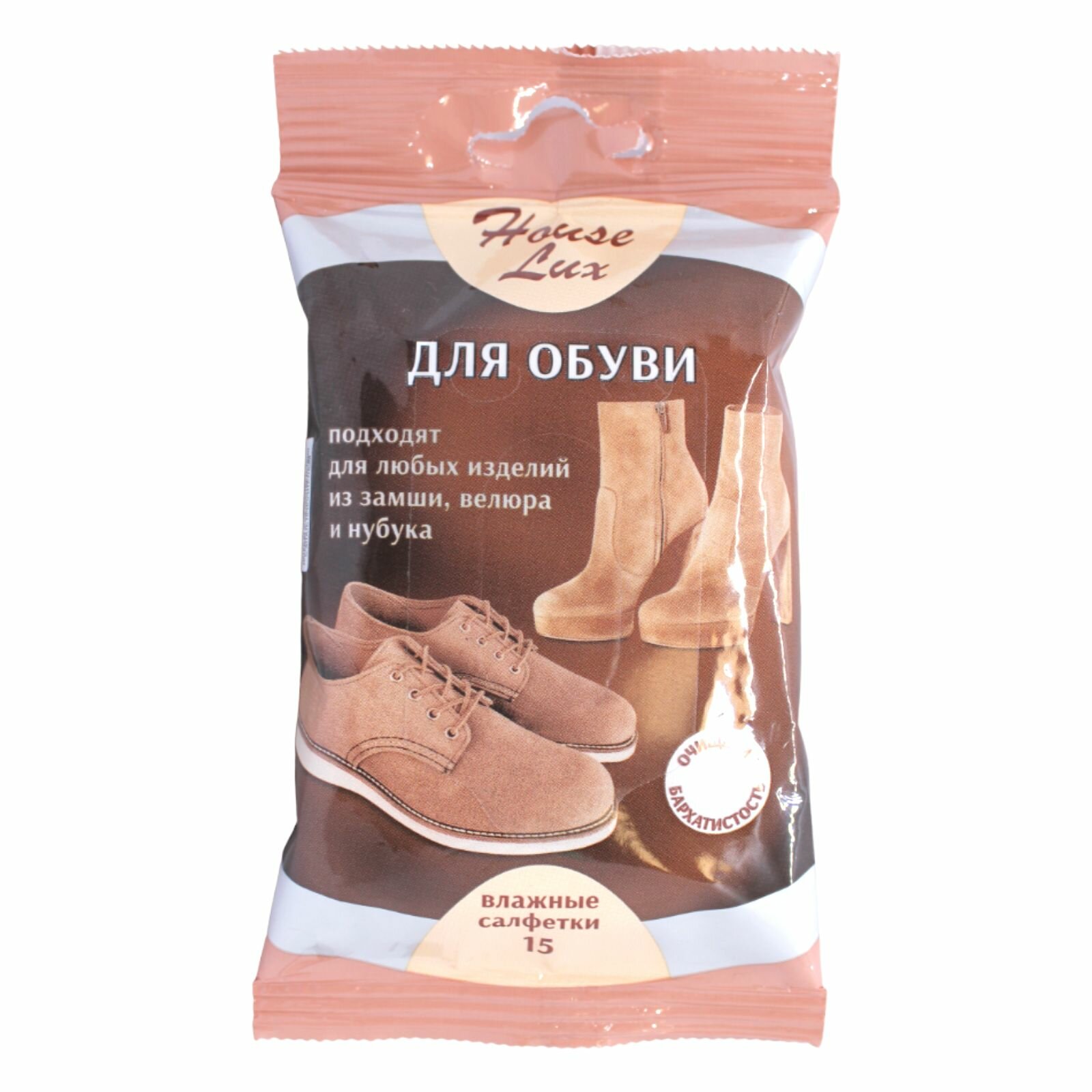 Салфетки влажные House Lux для обуви из замши/велюра/нубука. Влажные салфетки House Lux деликатно очищают, сохраняя интенсивность цвета и бархатистость поверхности изделий из замши, велюра и нубука. В состав лосьона входят натуральные масла, что обеспечивает сохранение первоначального вида изделий из ворсовой кожи. Компактная упаковка позволяет брать салфетки со собой. Пропитывающий лосьон безопасен для рук.
