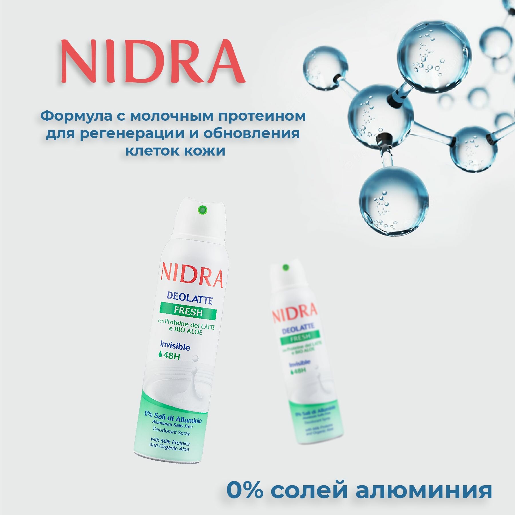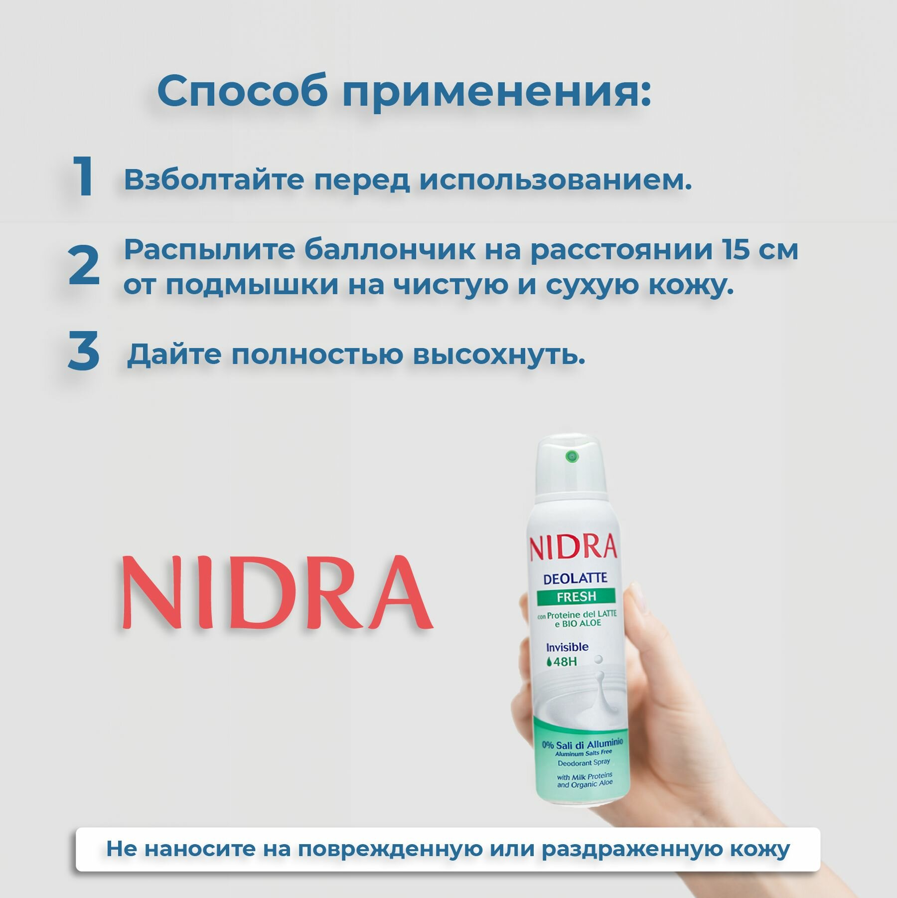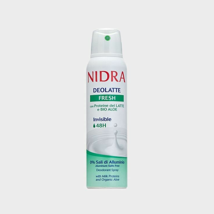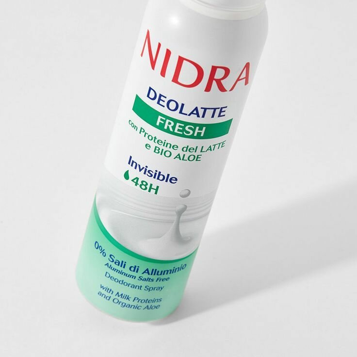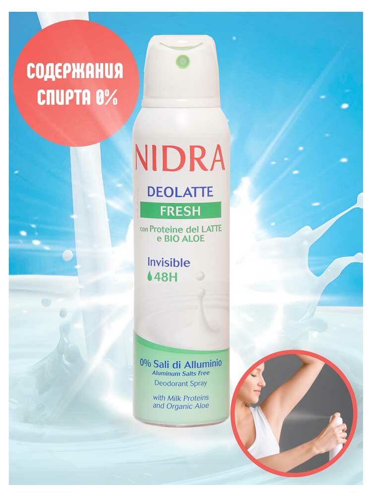 Дезодорант в аэрозольной упаковке освежающий с молочными протеинами торговой марки Nidra 150 мл. Формула обогащена молочными протеинами и натуральным экстрактом Алое Вера. Невидимая деликатная защита в течение 48 часов. 0% солей алюминия.