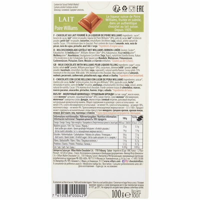 Описание товара:Бархатистая роскошь настоящего швейцарского молочного шоколада (какао не менее 31%) из швейцарского молока, идеально сочетается с оригинальным швейцарским грушевым бренди. Максимум вкуса благодаря щедрому содержанию начинки.Villars- первопроходец в производстве шоколада с алкогольными начинками.Плитка из тщательно продуманной коллекции, гармонично сочетающая, специально подобранные добавки с настоящим швейцарским молочным шоколадом премиум – класса. Villars - уникальные рецептуры, доведённые до совершенства.Состав товара:Сахар, масло какао, сухое молоко цельное, какао тёртое, грушевый бренди (8,5%), сухое молоко обезжиренное, фундук, молочная сыворотка сухая. Эмульгатор: соевый лецитин. Натуральный ароматизатор: ваниль. Сухого остатка какао не менее 31%, сухого остатка молока не менее 18%.