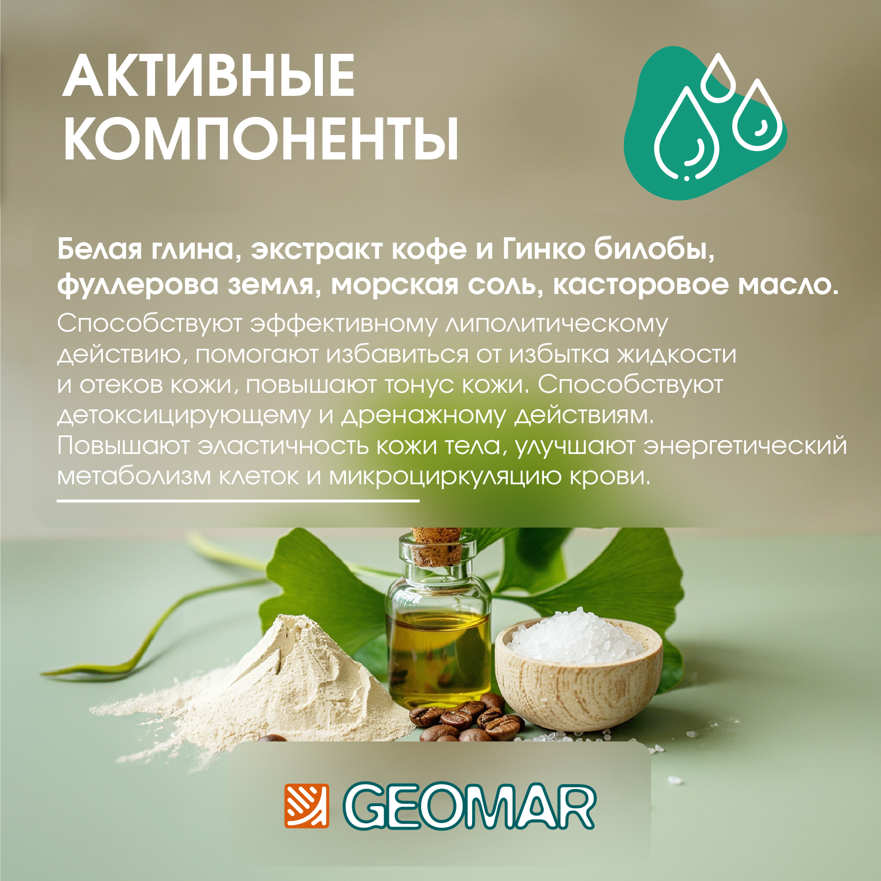 Современный итальянский бренд GEOMAR является производителем органической косметики для тела. Наша антицеллюлитный крем грязь на 95% состоит из ингредиентов природного происхождения. Грязевой крем действует на основе белой глины и идеально подходит для чувствительной кожи против отечности, способствует детоксицирующему и дренажному действиям. Кофеин и морские водоросли в составе способствуют эффективному липолитическому действию, а морская соль - помогает избавиться от избытка жидкости и отеков в коже. Наш глина помогает при борьбе с "апельсиновой коркой". Уже после первого применения кожа станет упругой и гладкой. Способ применения: Нанесите косметическую глину массажными движениями на влажную кожу и распределите равномерно по всему телу, оставьте на 10 минут, далее смойте остатки холодной водой Рекомендуется использовать 1-2 раза в неделю. Такой грязевой крем станет идальным подарком любимой женщине и девушке на 8 марта или день рождения.