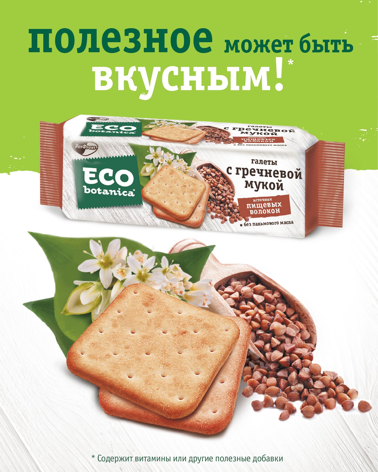 "Рот Фронт" представляет галеты "Eko-Botanica", созданные специально для тех, кто следит за здоровьем. Пищевые волокна, входящие в состав продукта, способствуют: активизации деятельности иммунной системы, снижению массы тела за счет улучшения микрофлоры кишечника, нормализации работы желудочно-кишечного тракта и очищению организма от шлаков и токсичных веществ и, как следствие, улучшению состояния кожи. Источник пищевых волокон.Без пальмового масла.